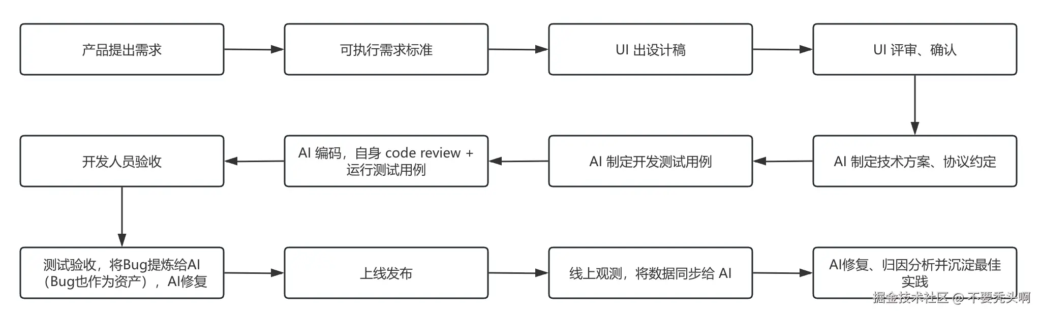 不是把原流程每一步都加个 AI 就是新的开发方式,而是需要真正思考AI时代下的新范式,把传统流程里"靠人搬运信息、补齐细节、重复劳动、低效回路"的部分,改成更短的闭环 + 更强的自动验证。