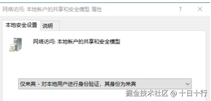 2、找到网络访问:本地账户的共享和安全模型,双击更改为仅来宾-对本地用户进行身份验证,其身份为来宾,点击确定。