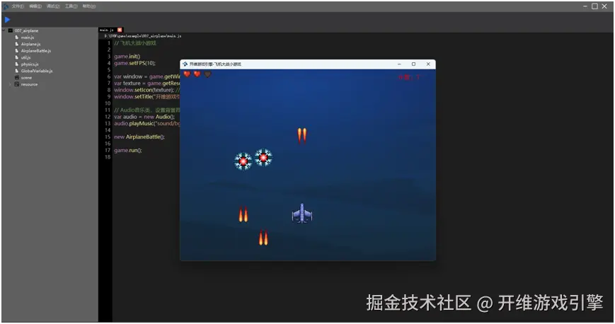开维游戏引擎(Kaiwei Engine)是基于js设计的跨平台游戏引擎。内核c++编写,v8引擎封装游戏函数,Assembly实现htm跨平台高效运行。下面以"飞机大战"小游戏为例,演示实现过程。