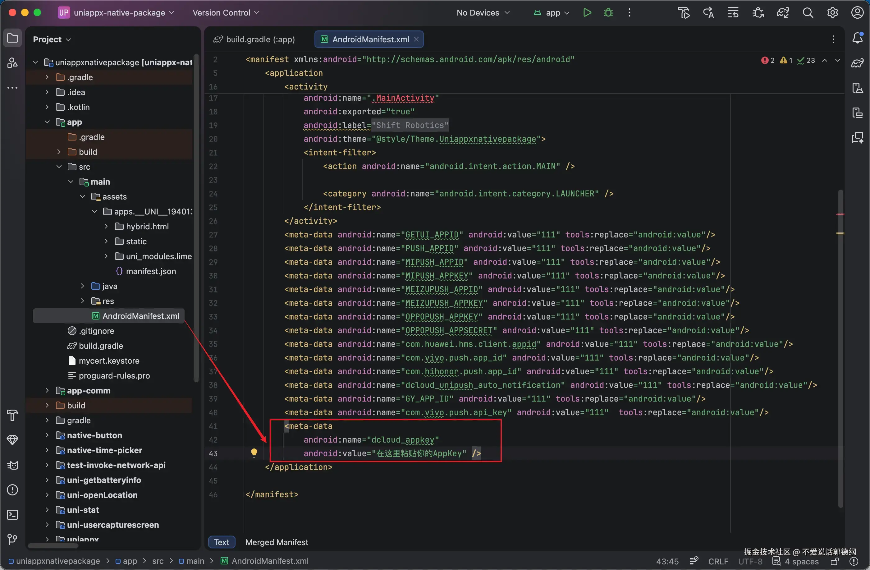 android:value="在这里粘贴你刚才生成的极长AppKey字符串" />