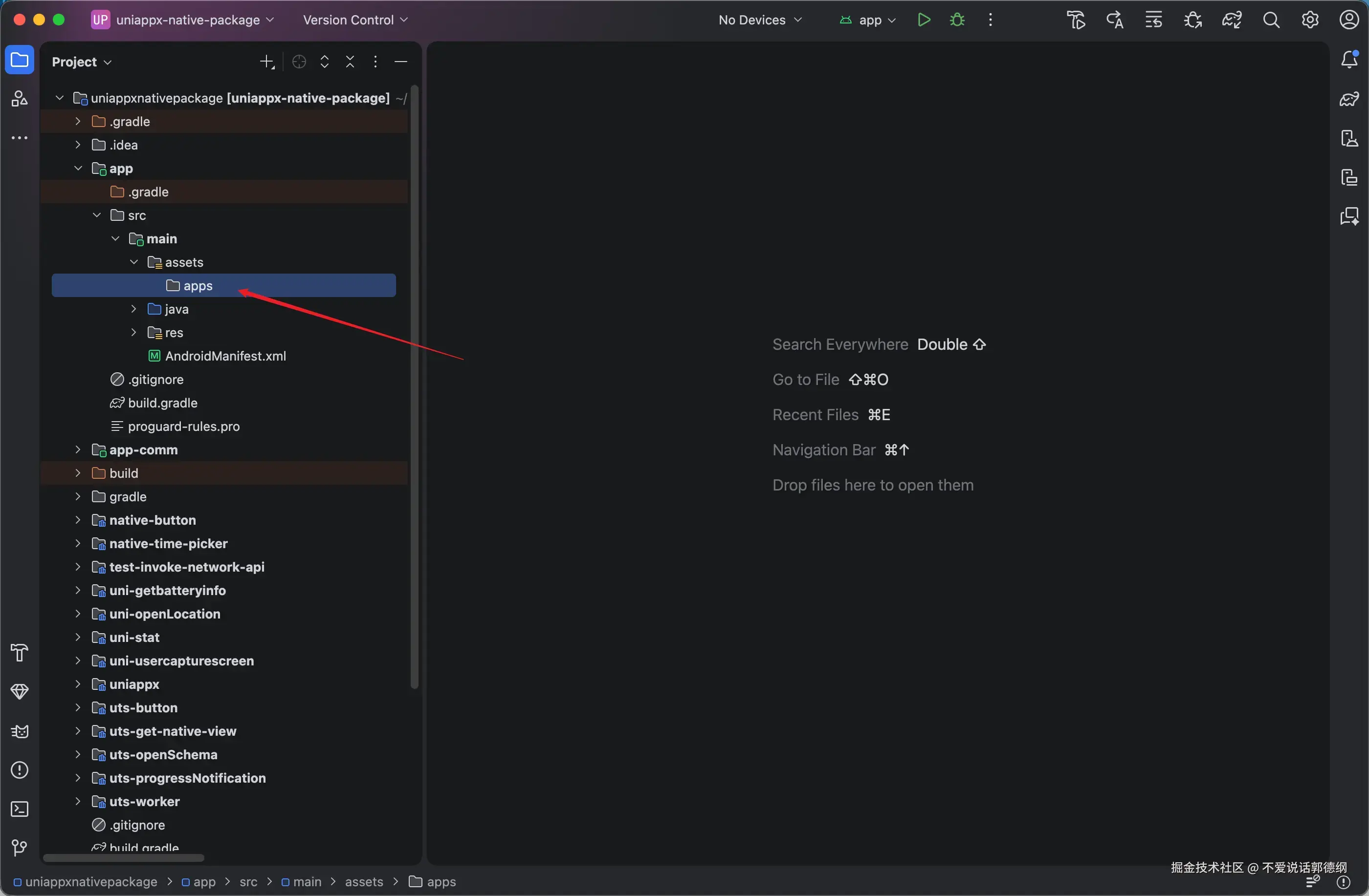 - 在 Android Studio 左侧目录树,依次展开:app -> src -> main -> assets -> apps。(如果找不到assets文件夹,可直接在main下自行创建)