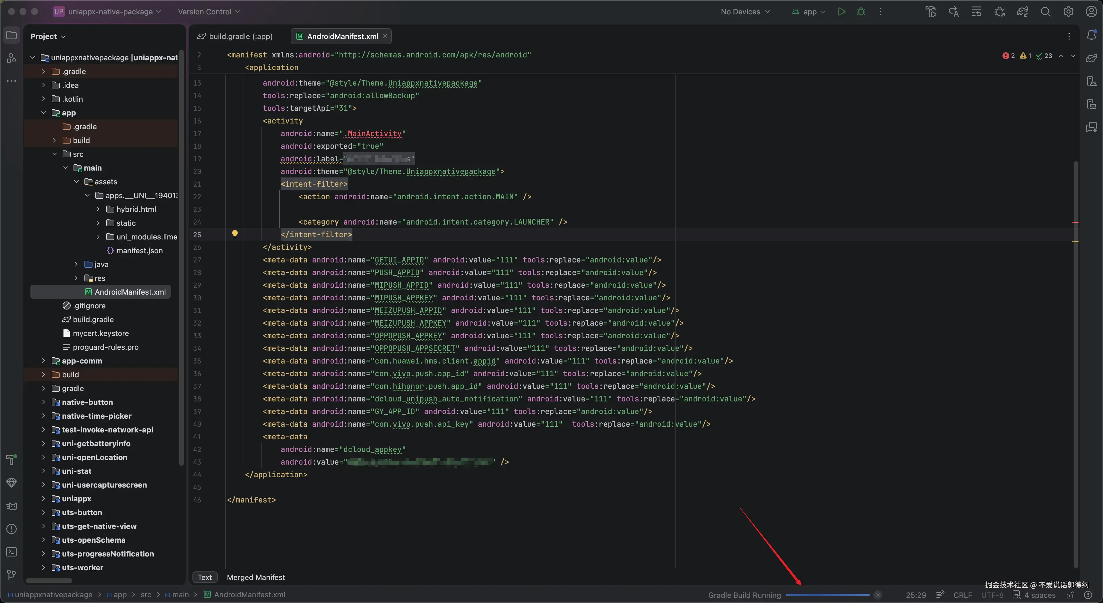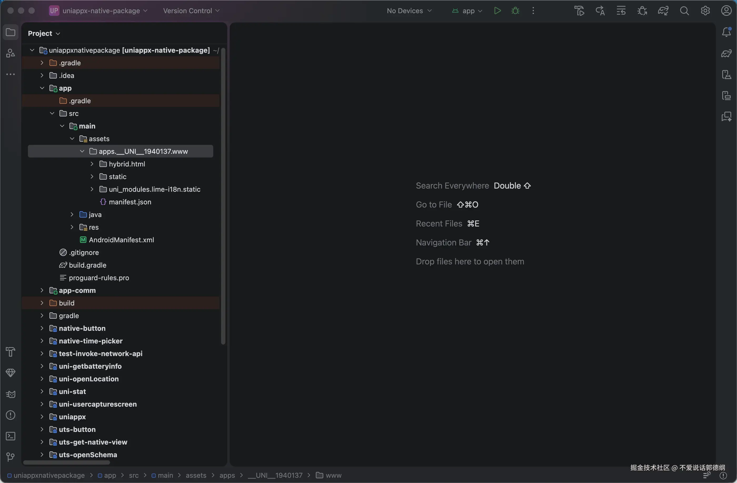 第一次本地打包由于要对齐包名、证书、AppKey,稍显繁琐。但这套流程跑通之后,以后你每次修改了前端代码,只需在 HBuilderX 里生成一下本地资源,去 Android Studio 替换掉 apps 目录下的文件夹,然后直接点 Build,20 秒左右即可一键出包!