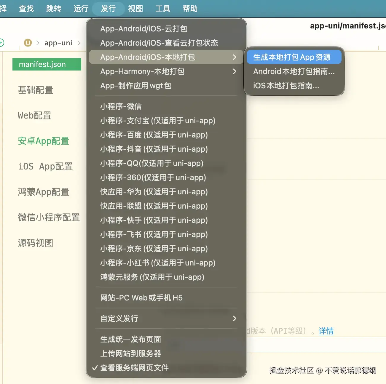 在你的 uni-app x 项目中,点击顶部菜单栏 发行 ➡️ 原生App-本地打包 ➡️ 生成本地打包App资源 。