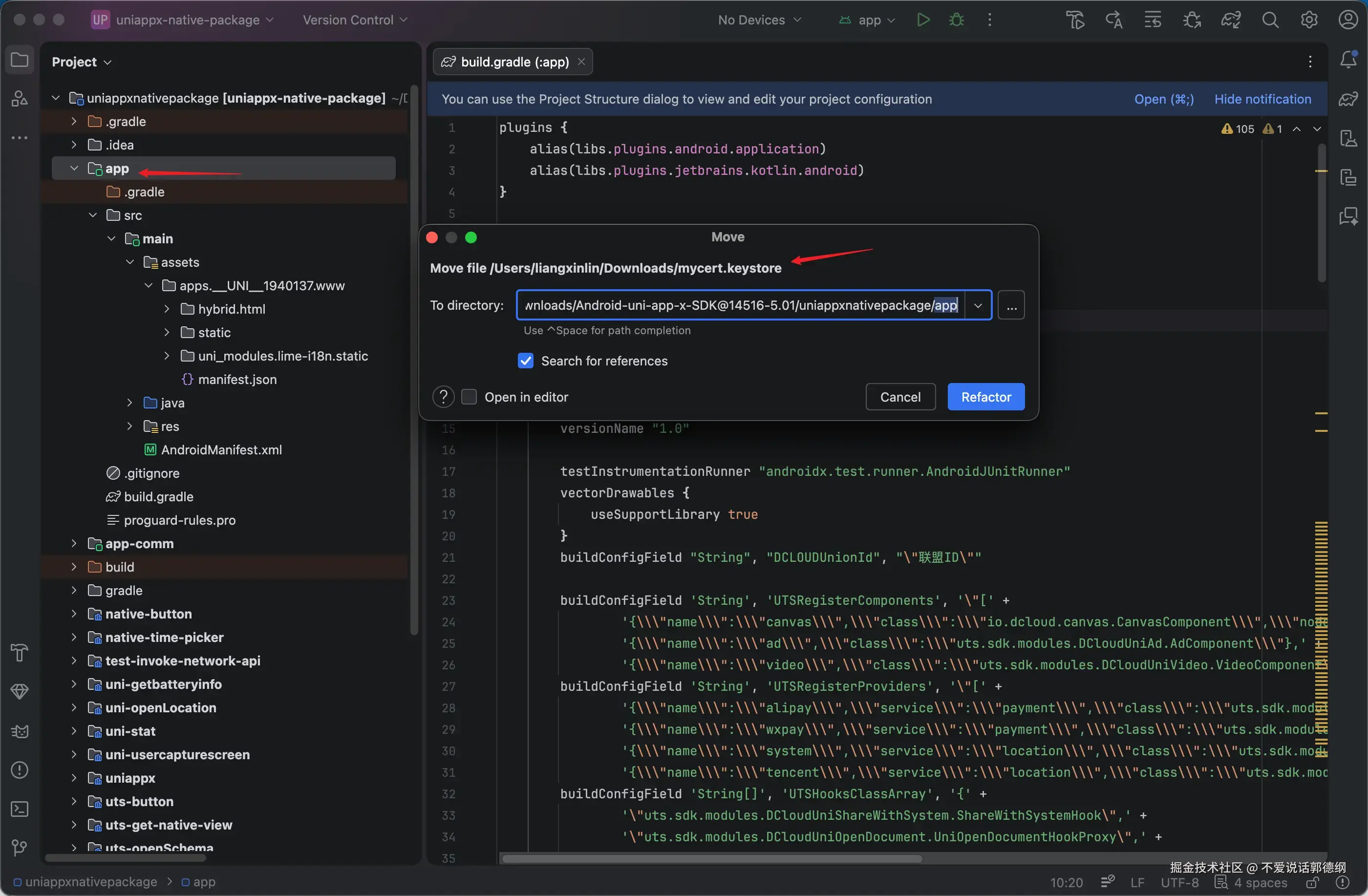 - 将下载好的 .keystore 证书文件,直接复制粘贴 到 Android Studio 左侧的 app 文件夹根目录下。(如下图所示放到app目录下)