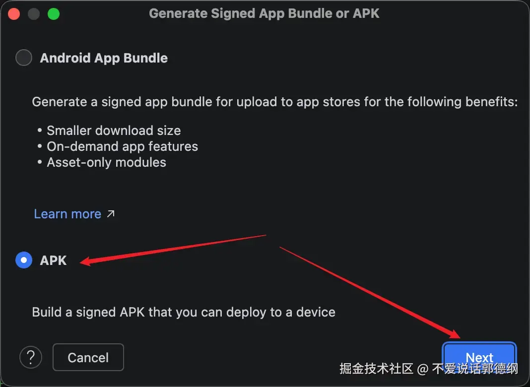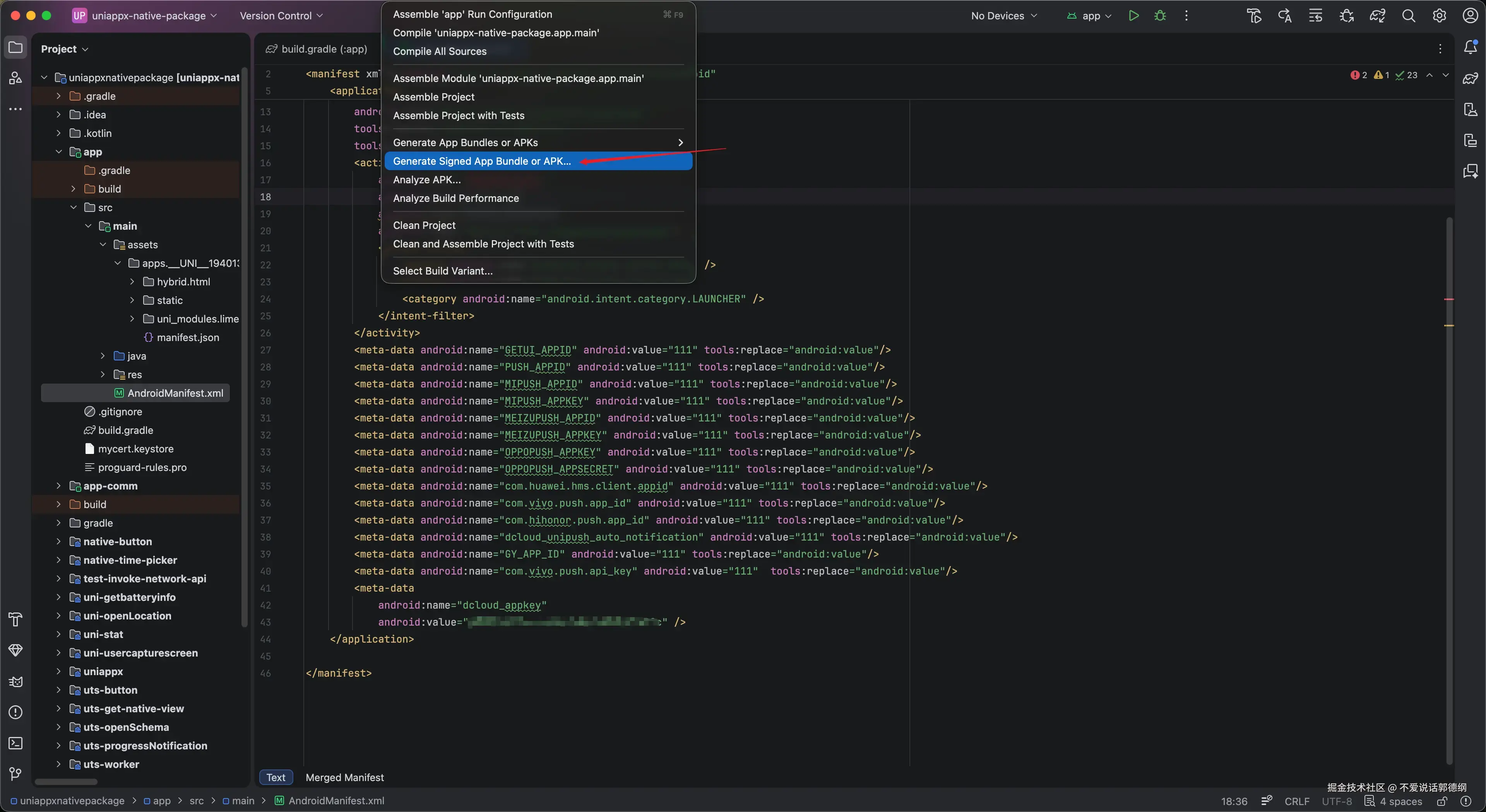 - 点击 Android Studio 顶部菜单栏:Build -> Generate Signed Bundle / APK...