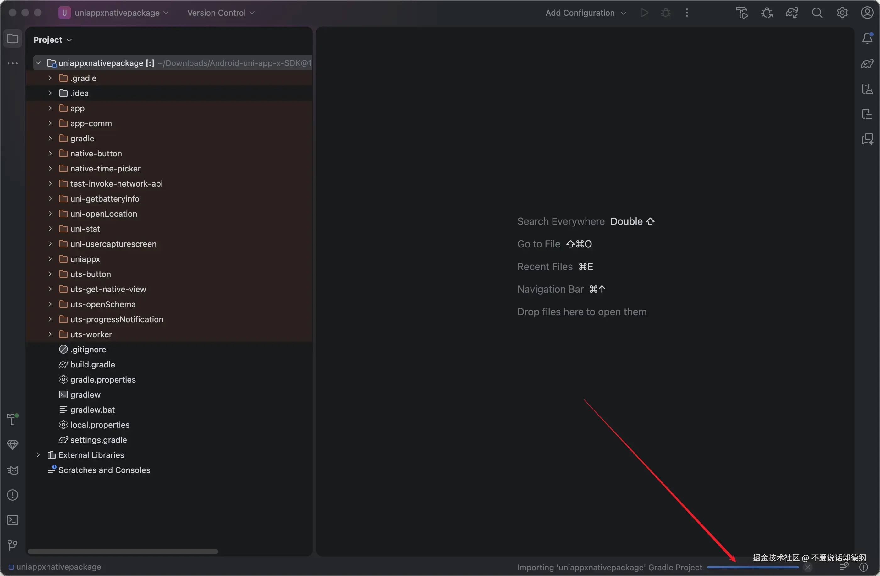 - 【注意:耐心等待】 打开之后,注意看软件的右下角 ,会有一个进度条在转,或者显示 Gradle Build Running... / Syncing...。