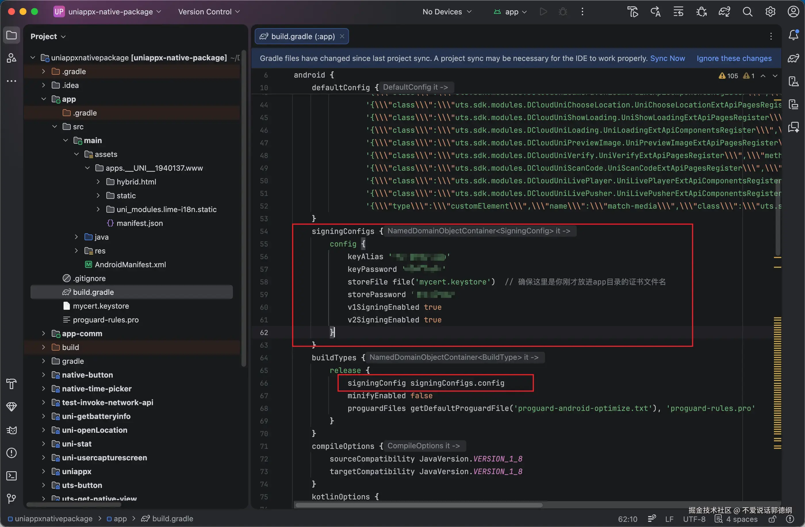 - 然后在下方的 buildTypes -> release 里面,加上一行引用:signingConfig signingConfigs.config。