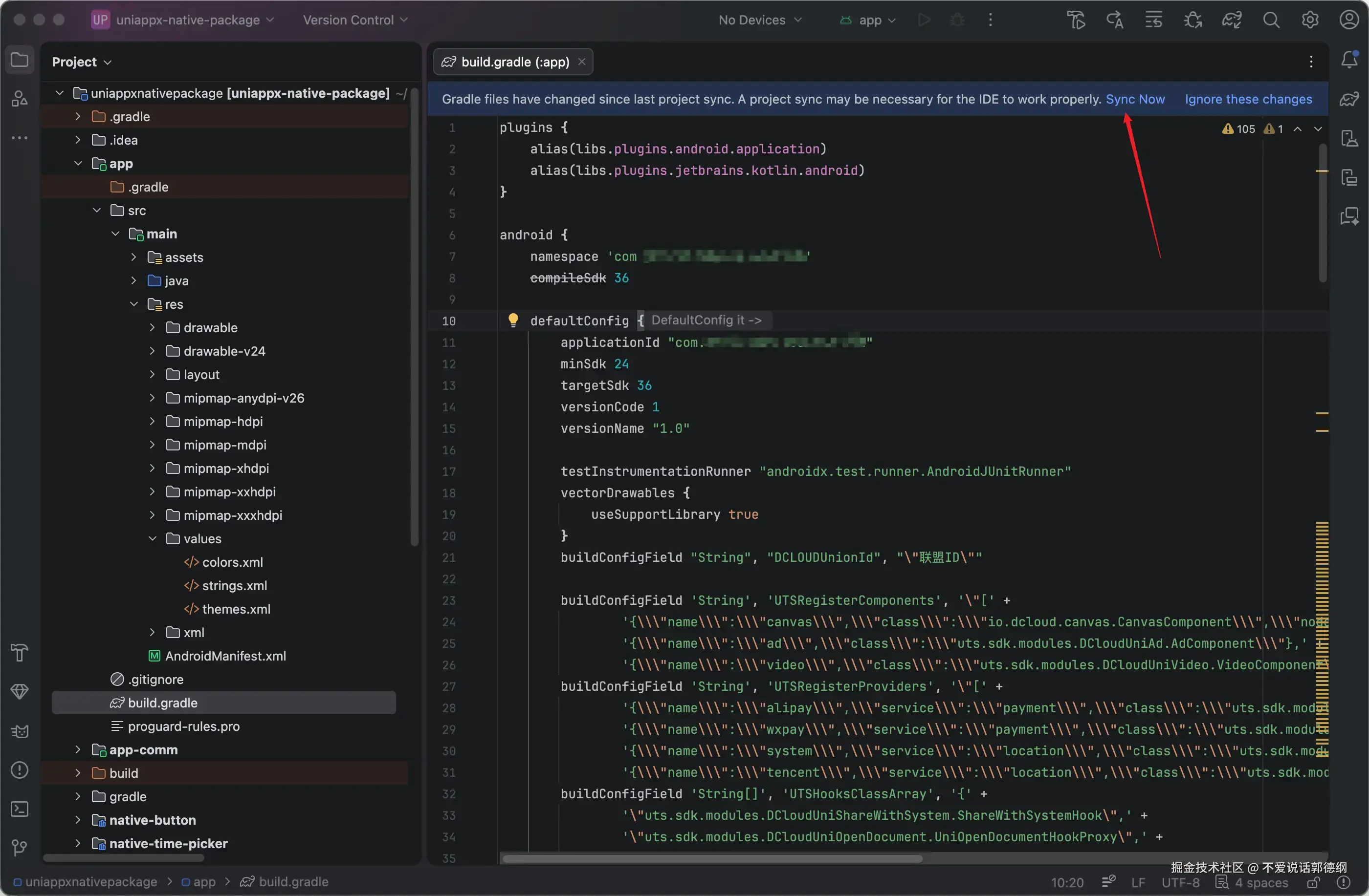- 注意:修改build.gradle 后要点击右上角的 Sync Now 应用一下,否则无效
