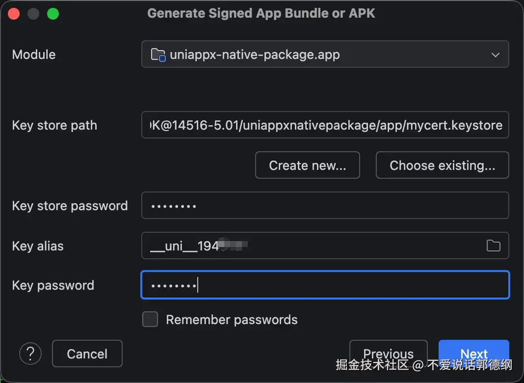 - 选择你的证书路径,填入密码和别名,勾选记住密码,点击 Next。