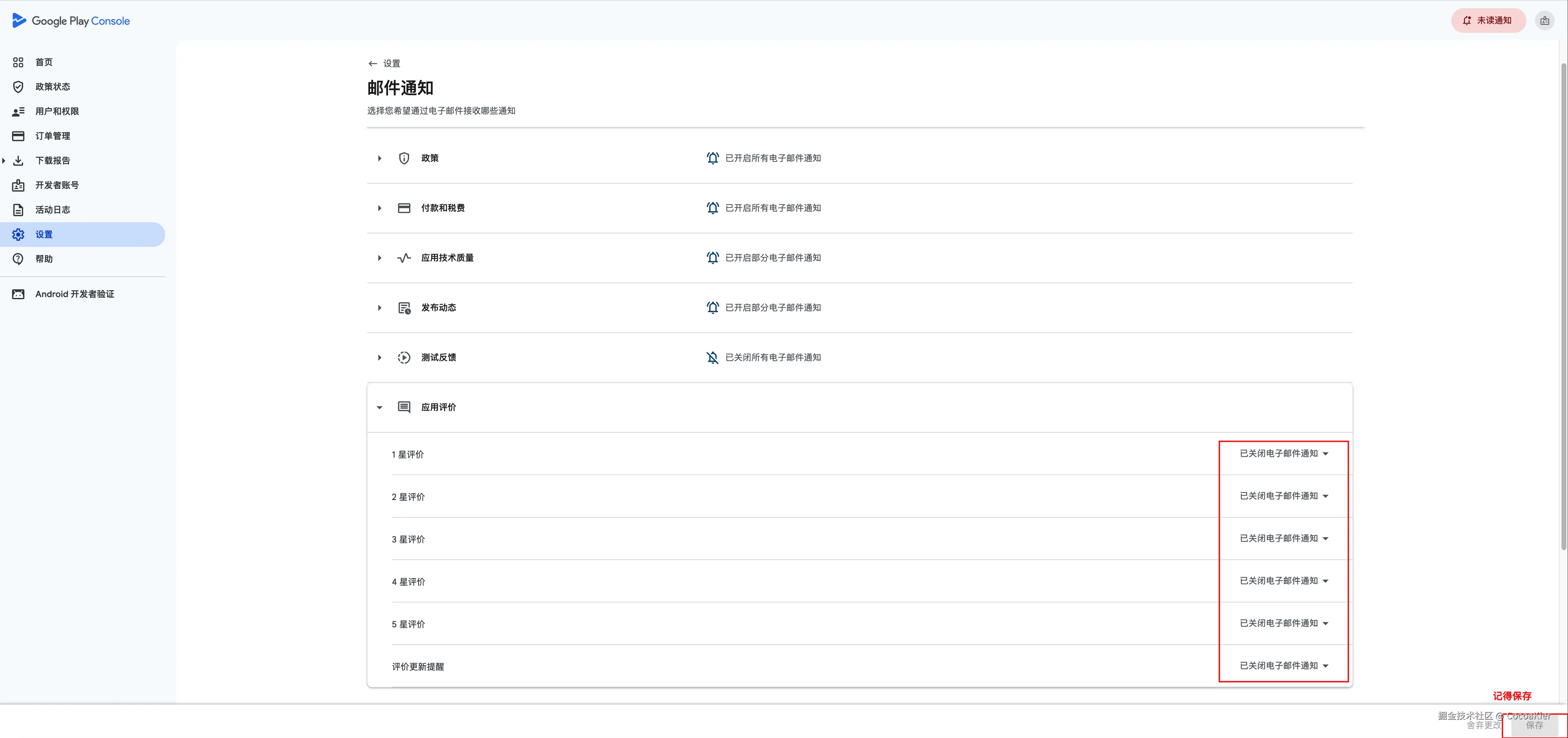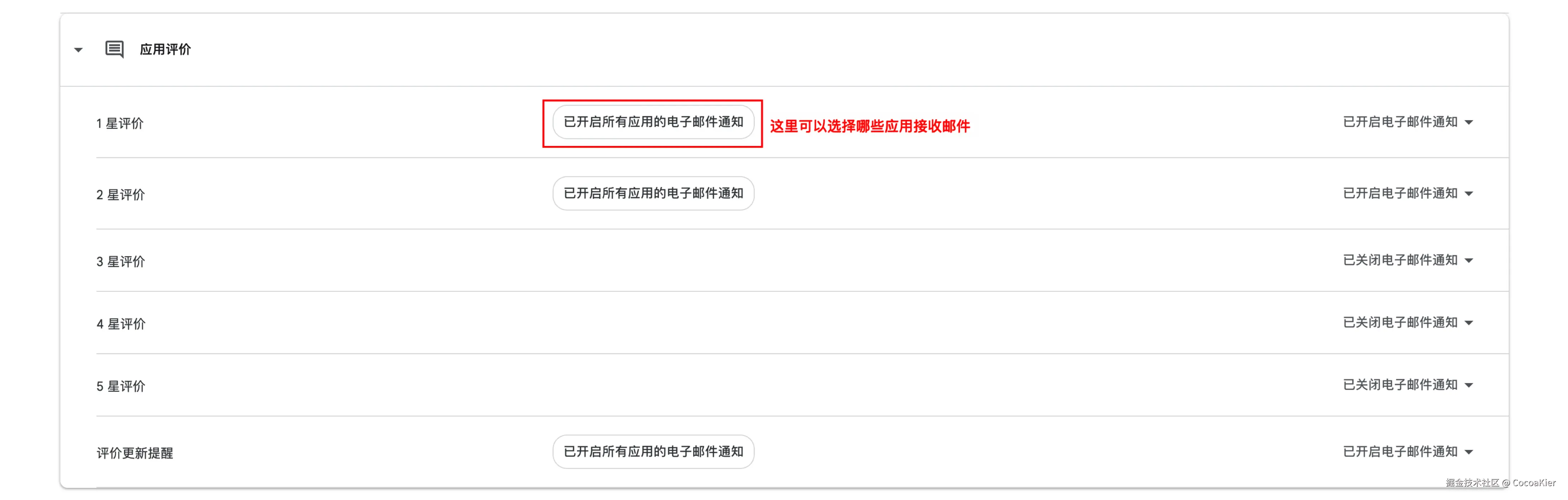 Google官方支持收到新的评论后邮件提醒开发者,并支持按应用、评分星级设置不同的提醒开关。注意:邮件提醒默认是关闭的,需要手动开启。请按下列步骤操作。