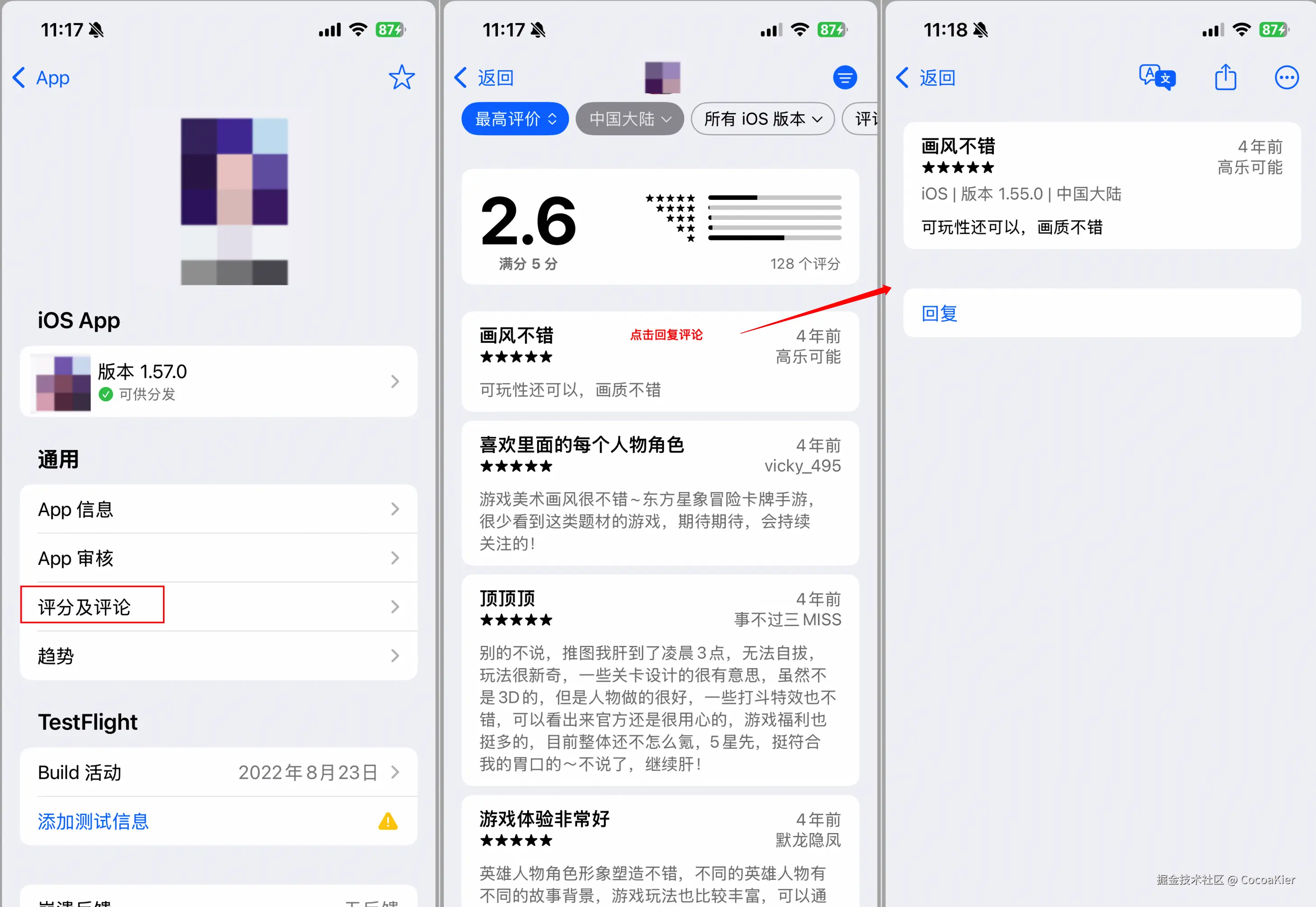 App Store Connect内查看评分及评论入口: