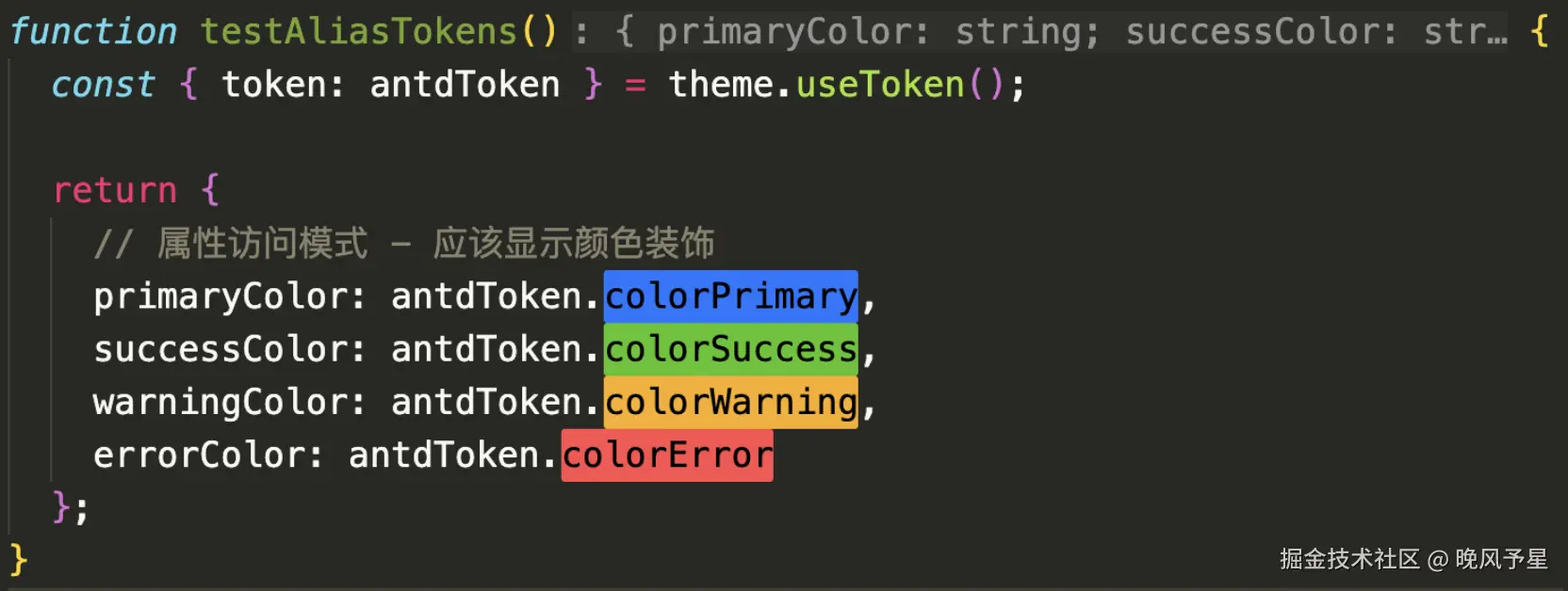 确实,在真实的业务场景下,我们通常会在 .tsx 或 .ts 文件中直接使用 Design Token,而不是像在 CSS 里那样使用 --ant- 前缀的 CSS 变量。如果代码编辑器不能解析这部分的变量值,开发体验就不算完美闭环。