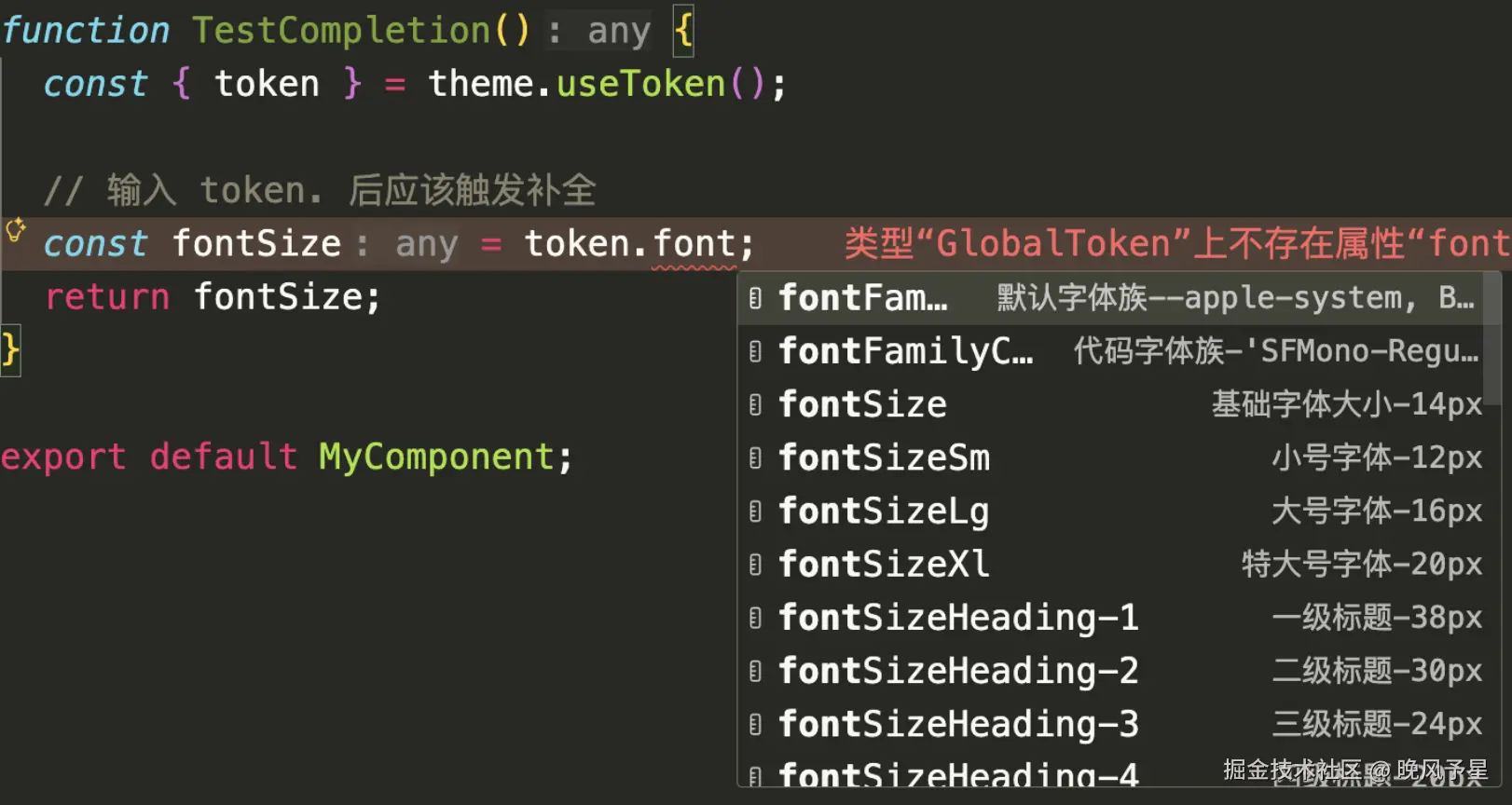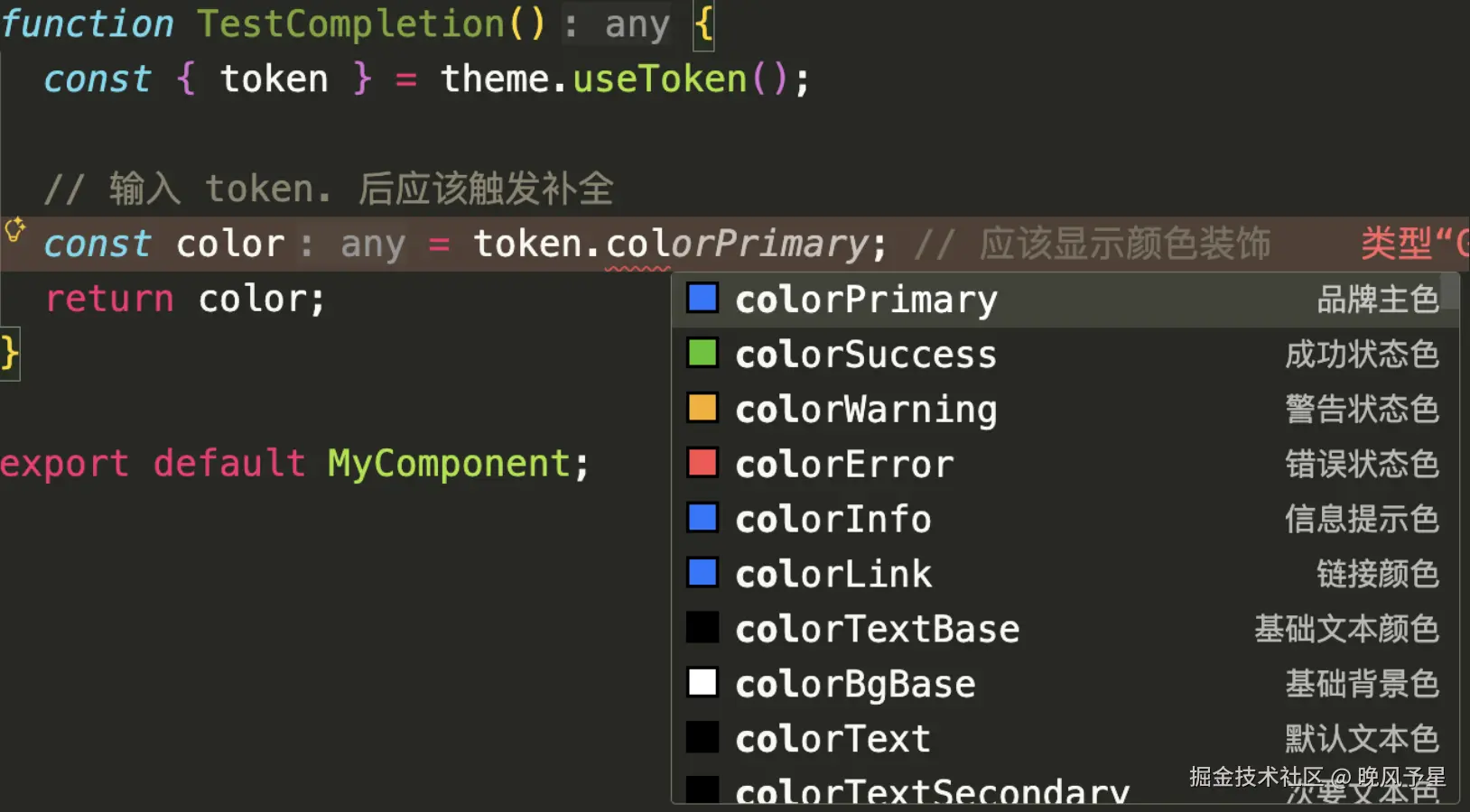 token.(甚至是你解构出来的别名,比如myToken.),即可瞬间唤起全量 Token 提示列表。列表中不仅有名称,同样带有颜色预览和中文语义描述。