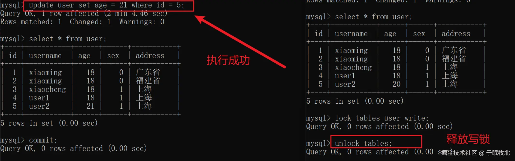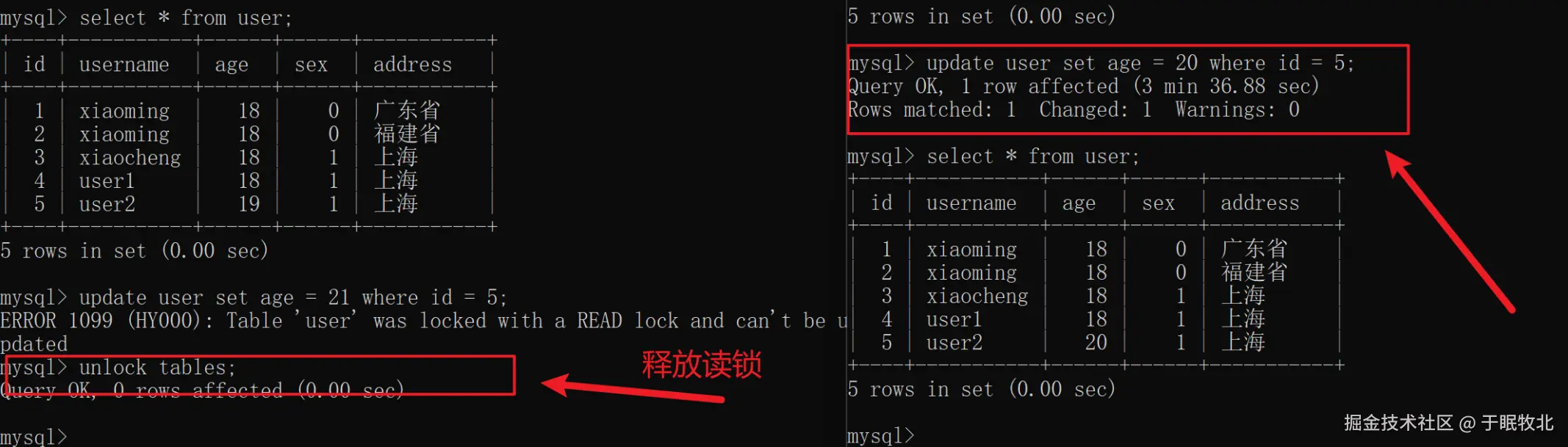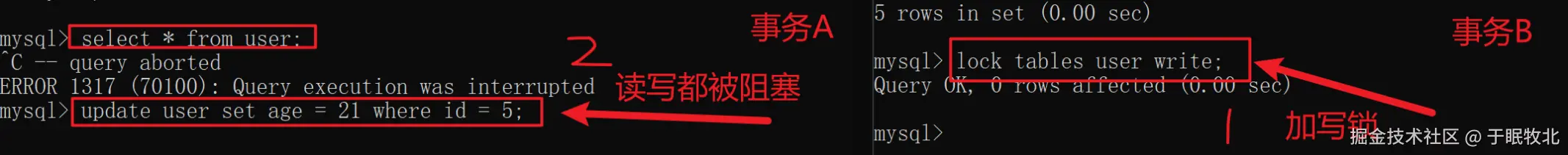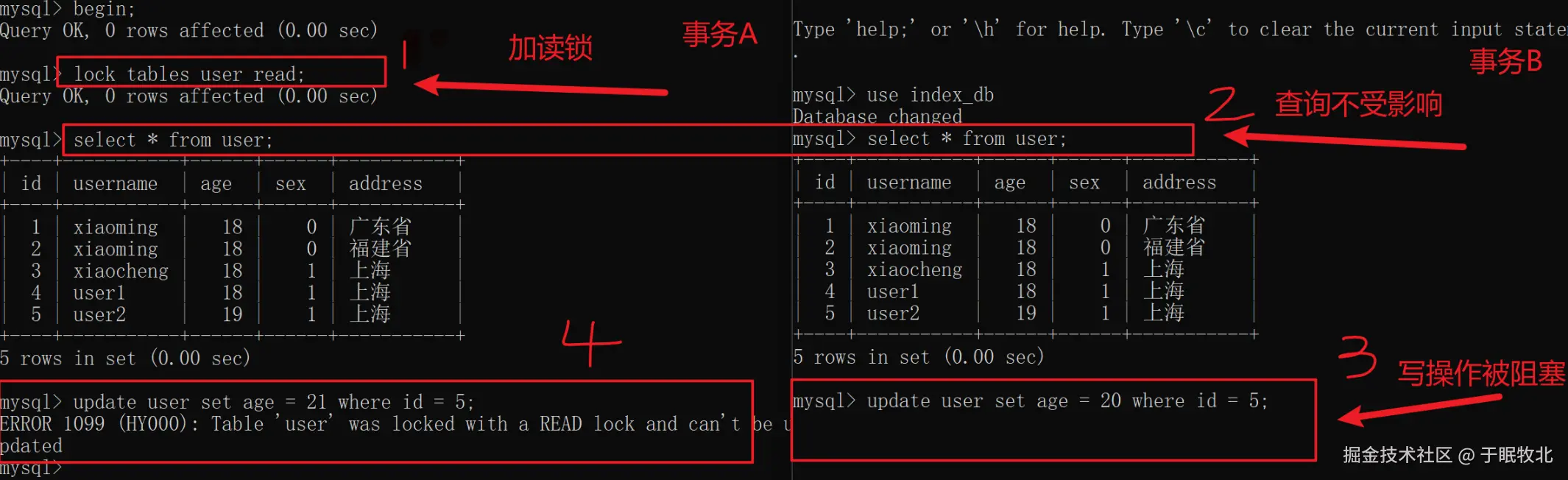 - 事务A:先对user表加读锁,查询user表信息