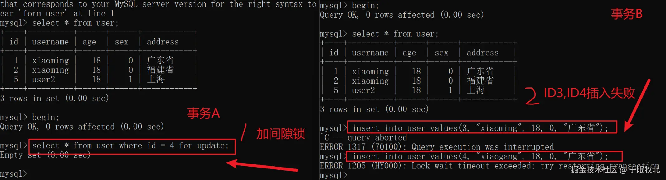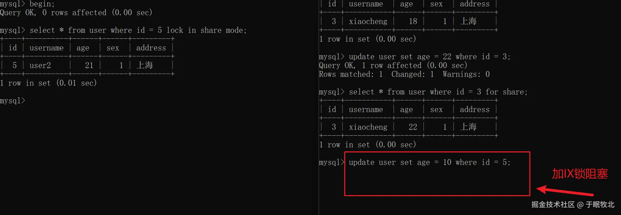 这里为什么事务B加意向排他锁会被阻塞,不是意向锁之间共存吗? 原因是因为这里查询的是一整张表,事务A在对表user加意向共享锁IS后,查询数据时对表user加了S锁,事务B在对表加意向排他锁IX之后,由于S锁和意向排他锁IX不兼容,所以进行了阻塞等待,再往下看另外一个例子