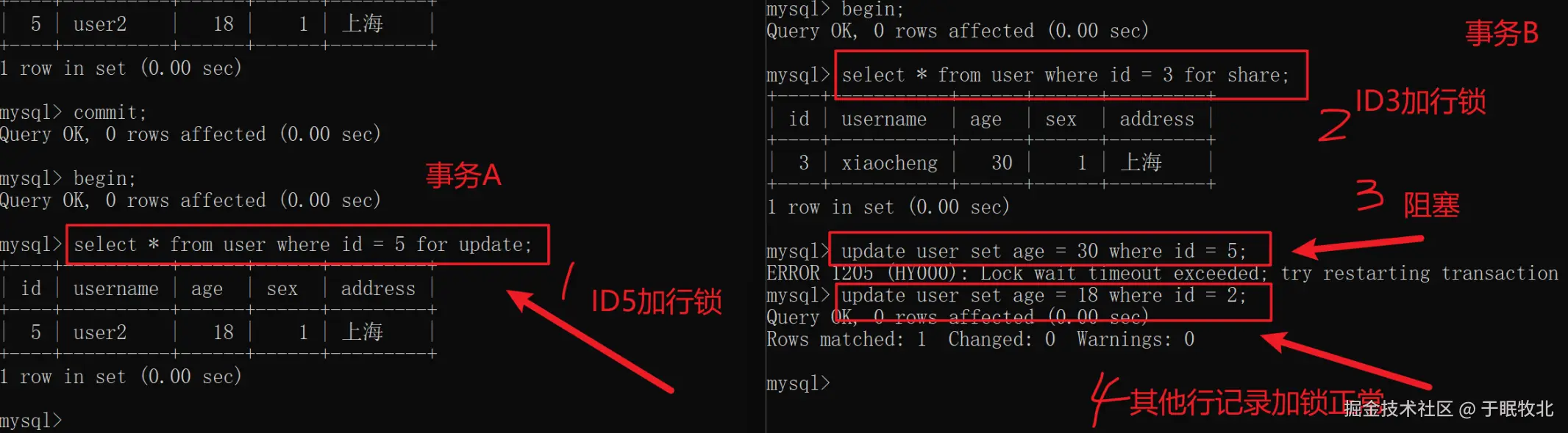 事务A对ID5加排他锁后,事务B想要再加排他锁时会阻塞,但是对ID3加共享锁可以,对ID2加排他锁也可以