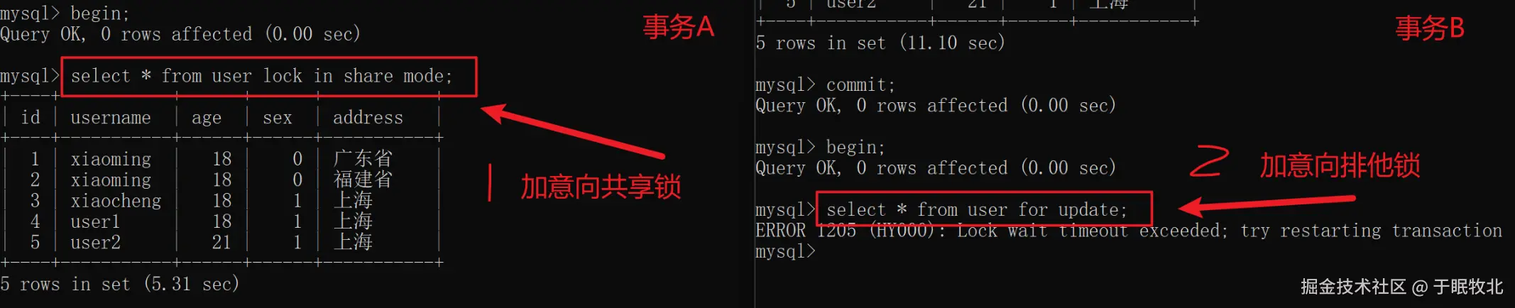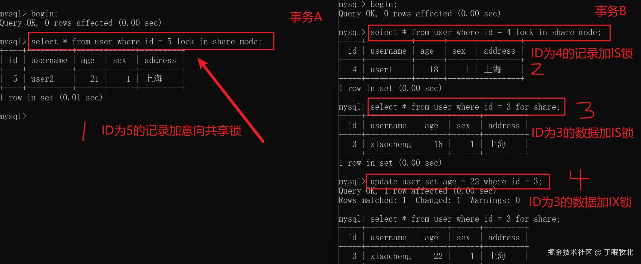 在user表中,由于使用了where查询,且id为主键,使用到了聚簇索引,在此索引基础上,使用意向锁时,加的S锁或者X锁就是行级S锁、行级X锁;在事务A、B并发执行过程中,查询时先校验是否可以获取到IS锁,在写入时判断是否可以获取到IX锁,具体执行过程中还需要对对应数据加S锁或者X锁