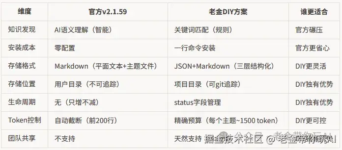 说到这里,老金我得说句实话。 官方自动记忆在知识发现上是碾压级别的------Claude用AI语义理解来判断什么值得记,这个能力任何规则匹配都拍马赶不上。