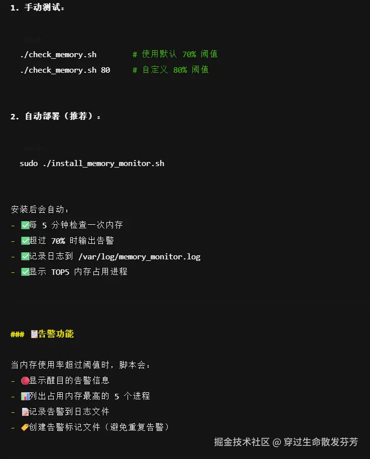 检查服务器的内存使用情况,并且写一个脚本自动检查内存使用,超过70%就进行告警提示。