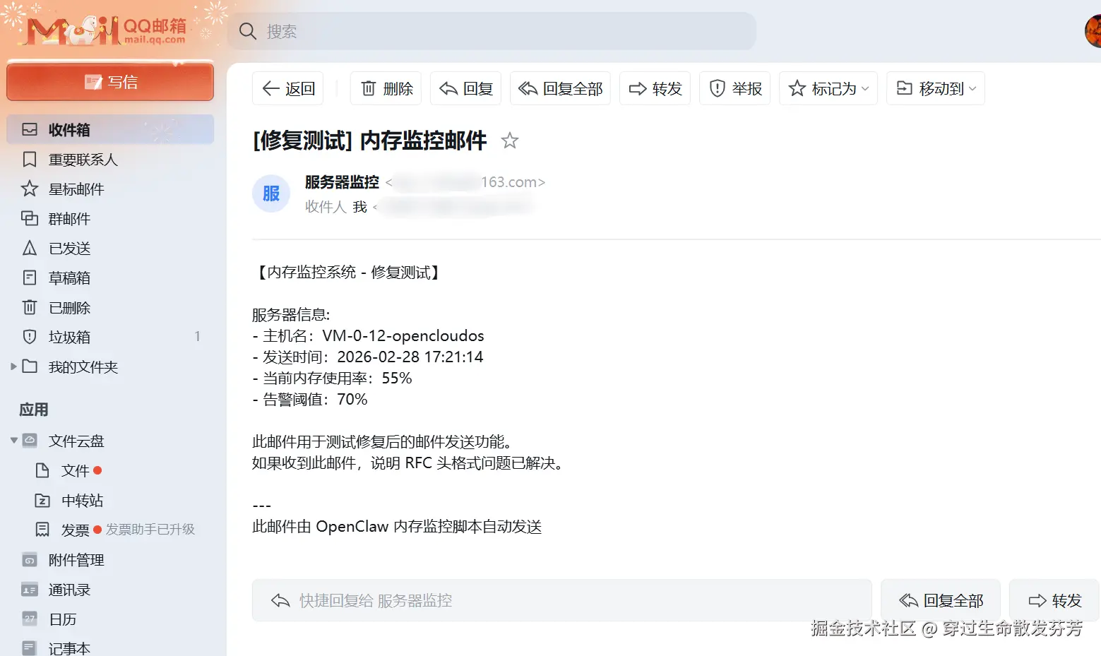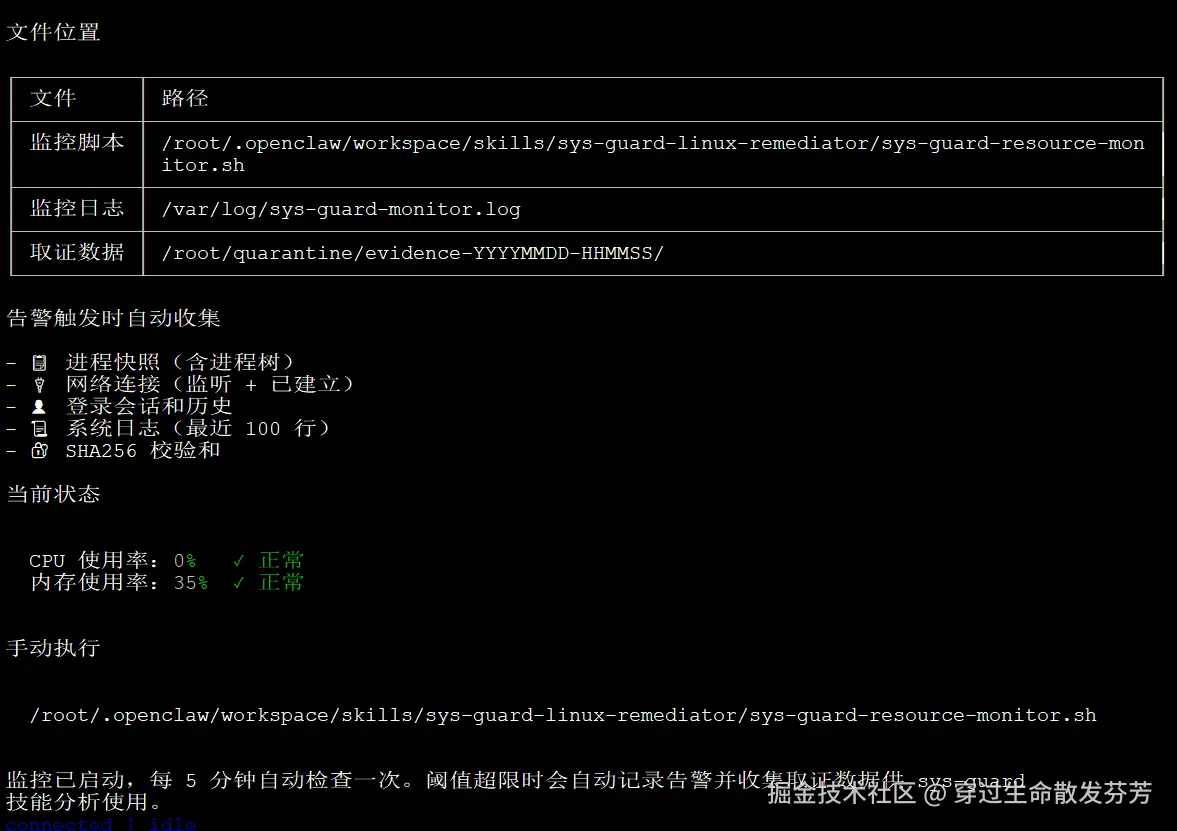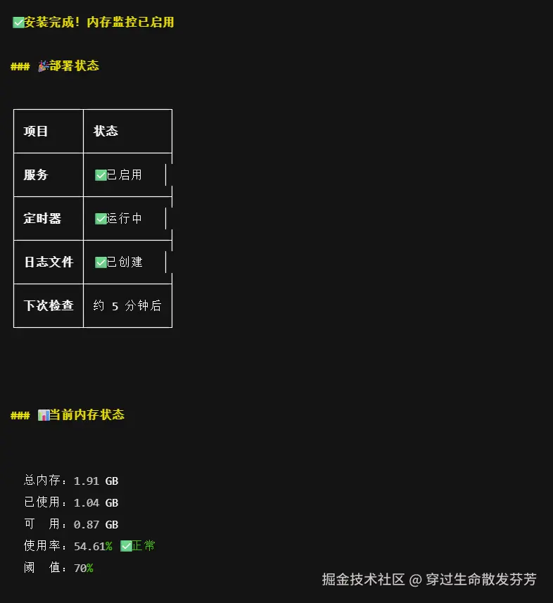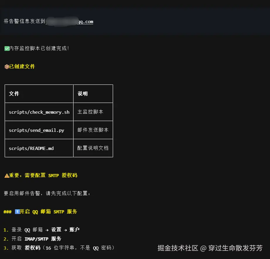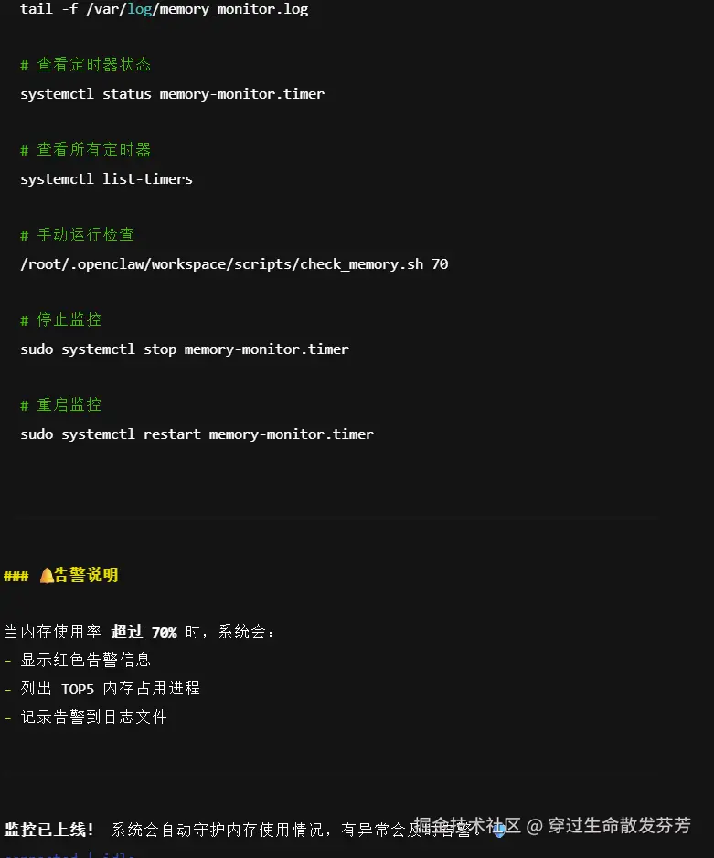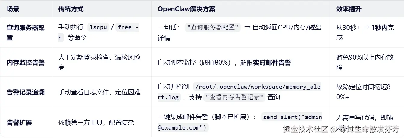 ✅ 示例交互流程 :运维人员说: "检查内存使用,超过70%就告警" → OpenClaw自动生成并部署监控脚本→ xx:xx内存达82% → 自动发送邮件至