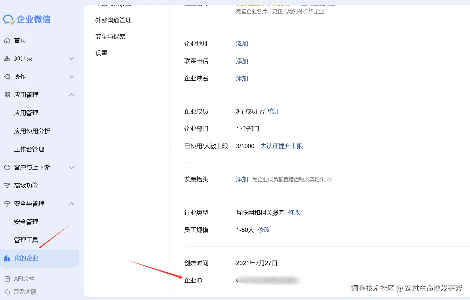 - Corp ID,我的企业-企业信息"页面,在页面底部找到企业ID。