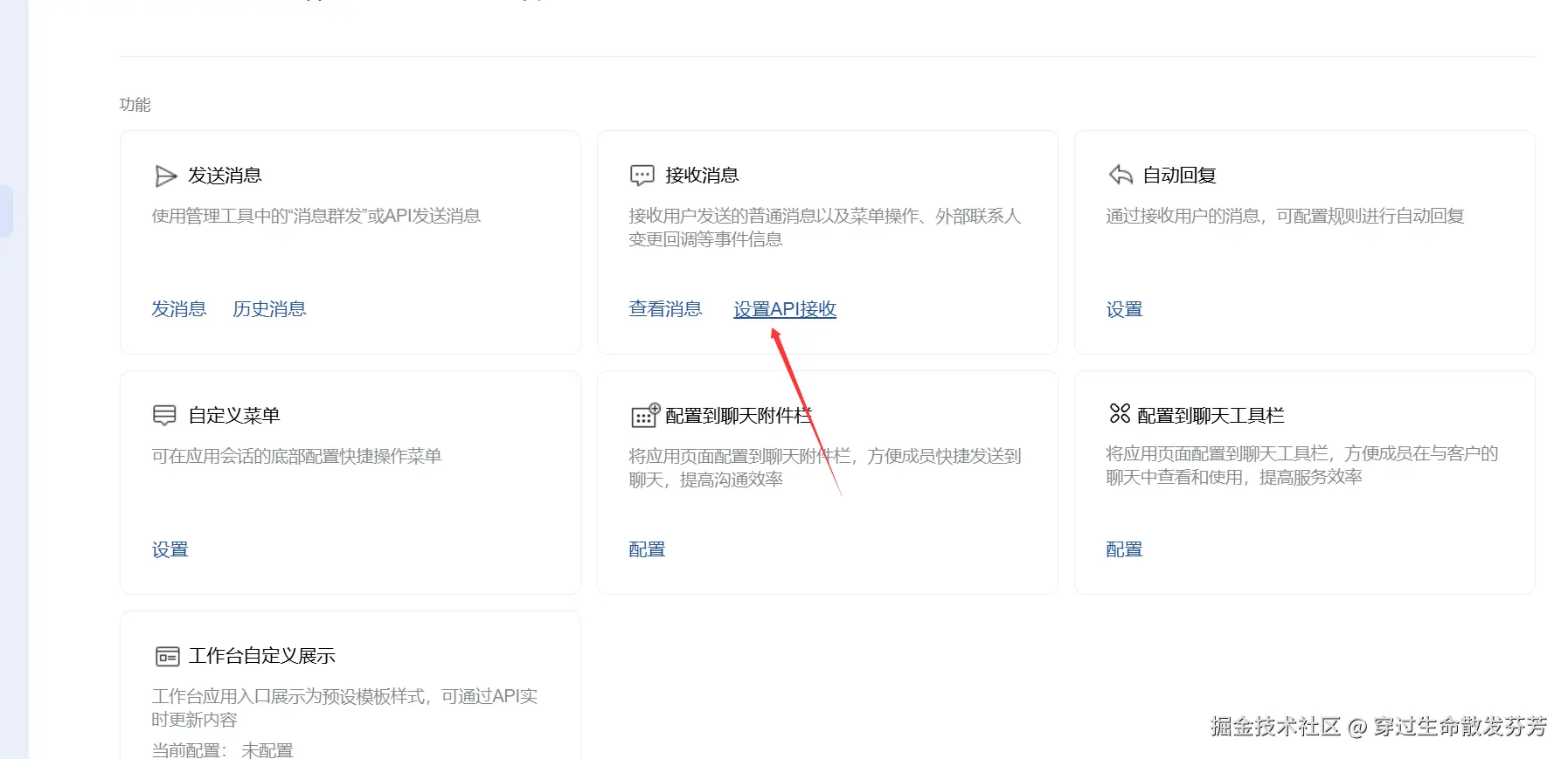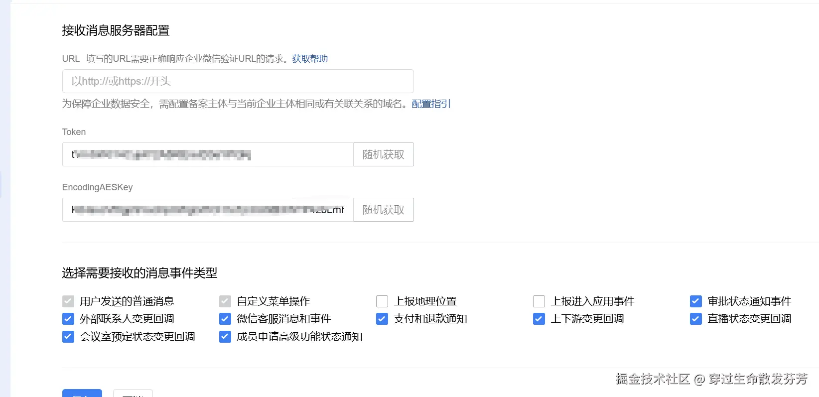 - Token和EncodingAESKey,找到"功能-接收消息",点击设置API接收,然后随机获取。