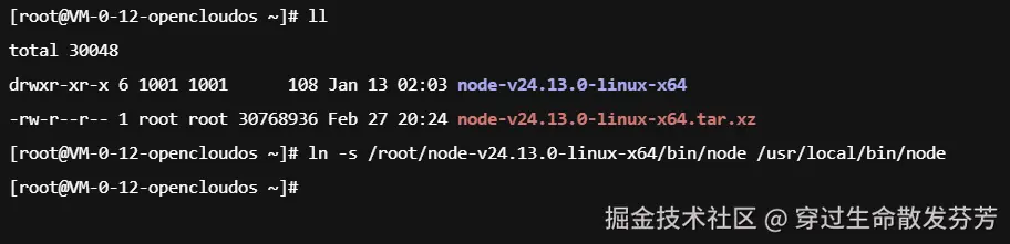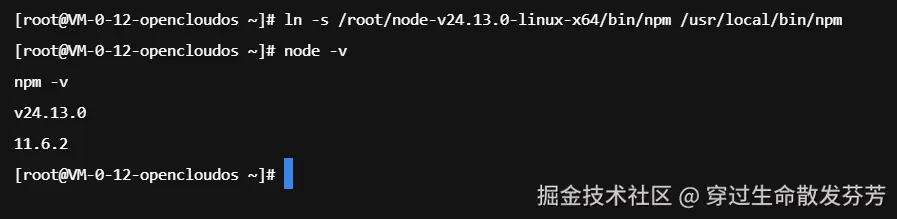 成功创建软链接后,即可在服务器任意目录下使用 node 及 npm 命令。