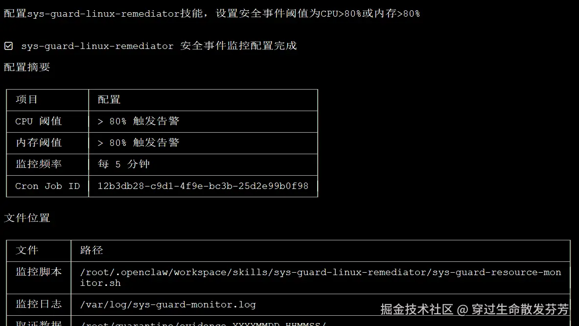 配置sys-guard-linux-remediator技能,设置安全事件阈值为CPU>80%或内存>80%