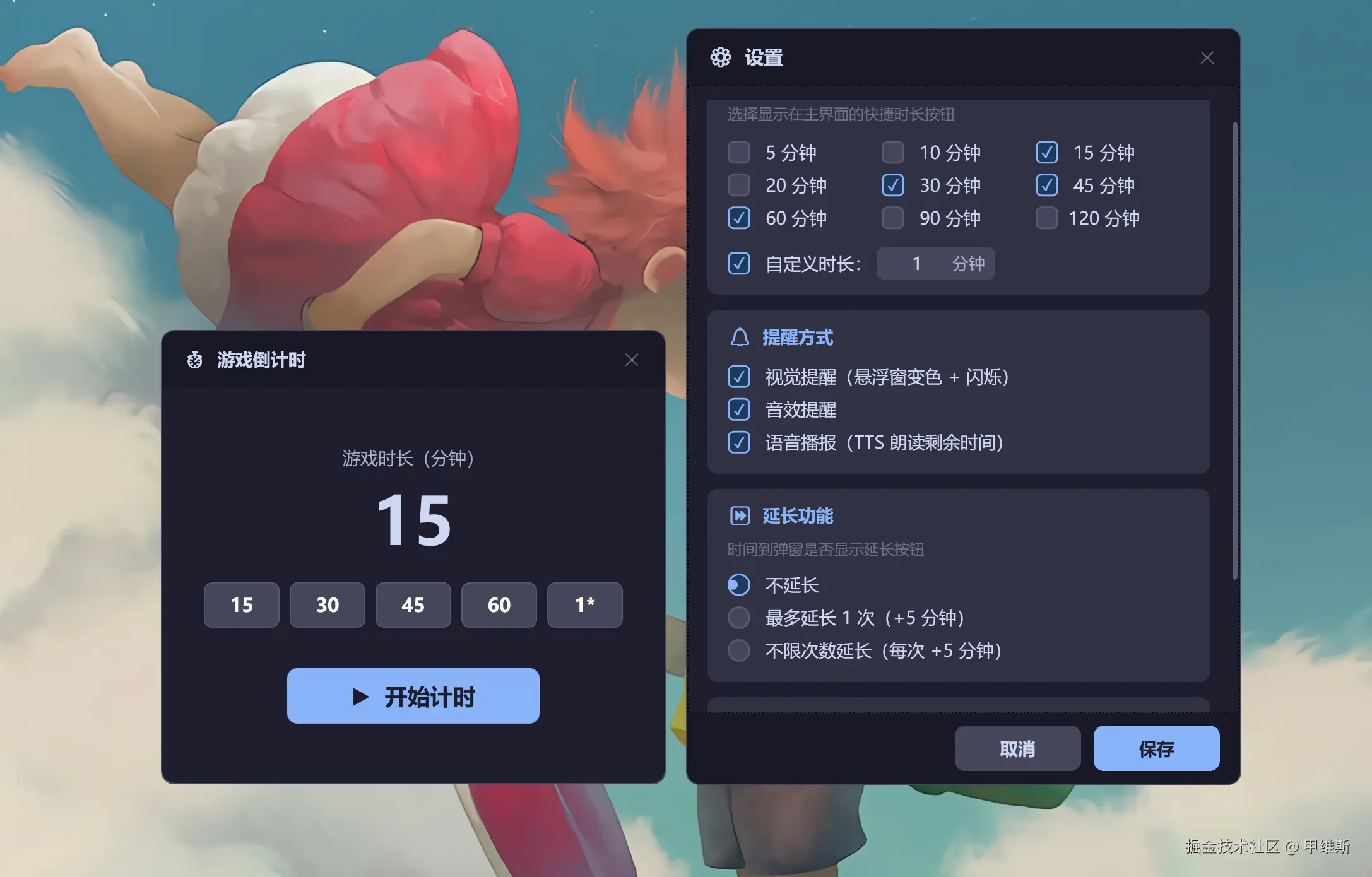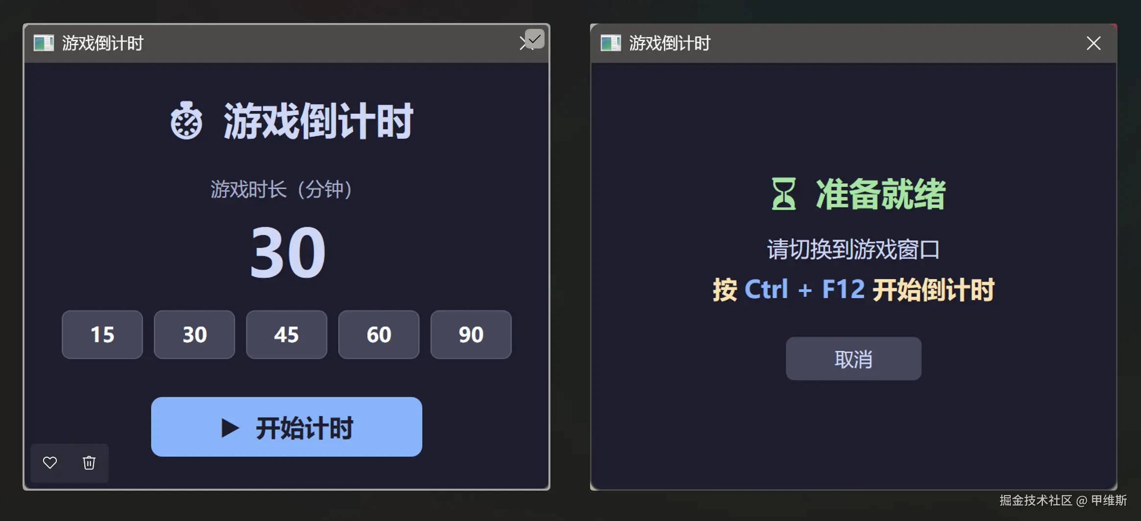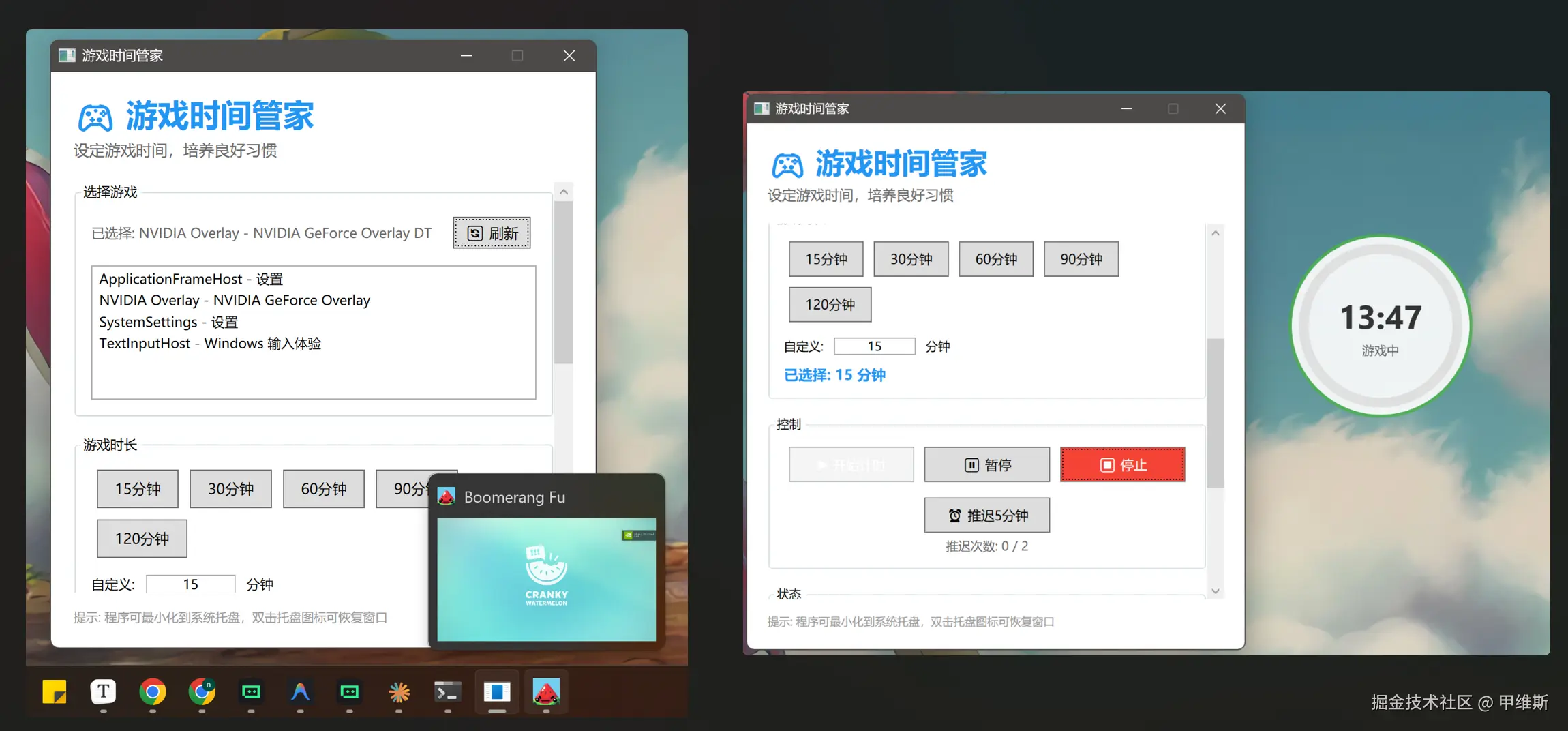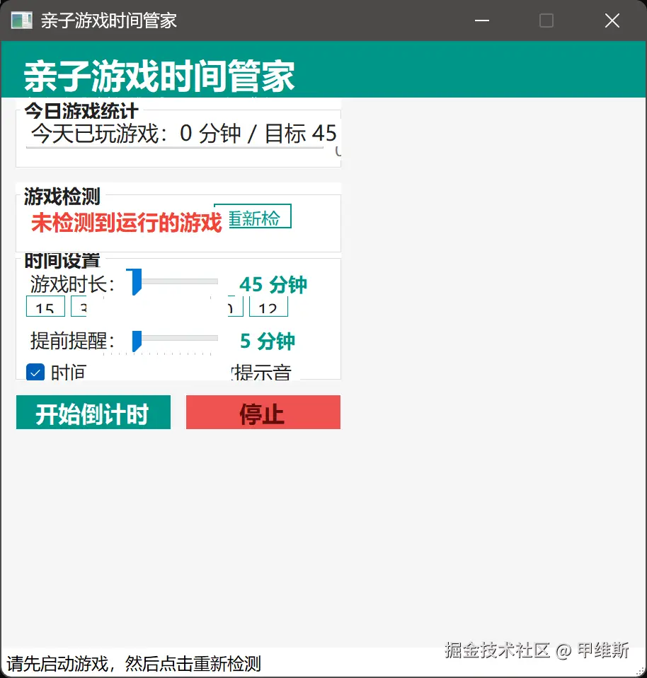 需求很简单,开发一个电脑游戏🎮防沉迷功能,设置一个倒计时,时间到了自动关闭电脑上正在运行的游戏。