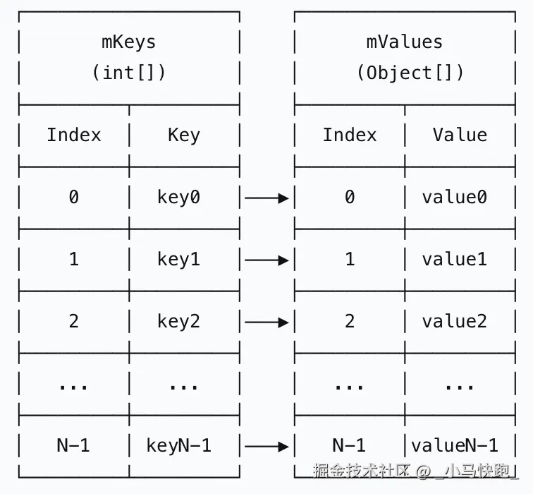 SparseArray 使用两个并行数组:mKeys数组按升序存储int类型的键,mValues数组存储对应的Object值。通过有序的键数组实现二分查找,在键为int类型的场景下避免了自动装箱开销,比HashMap节省内存。