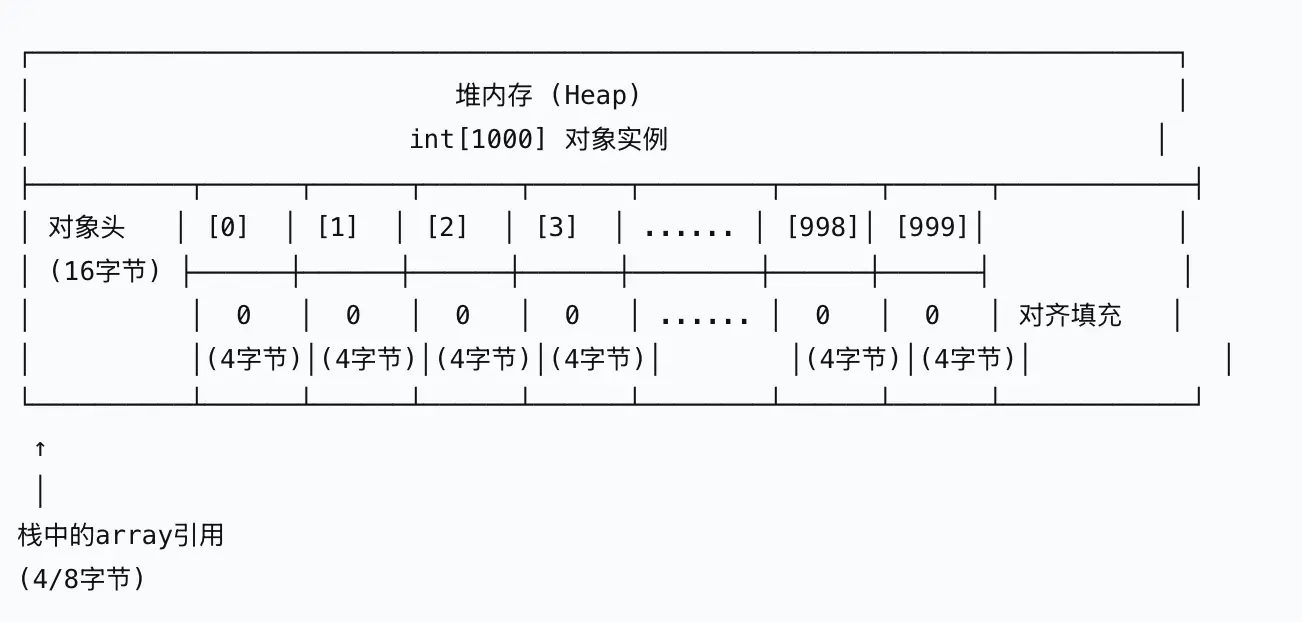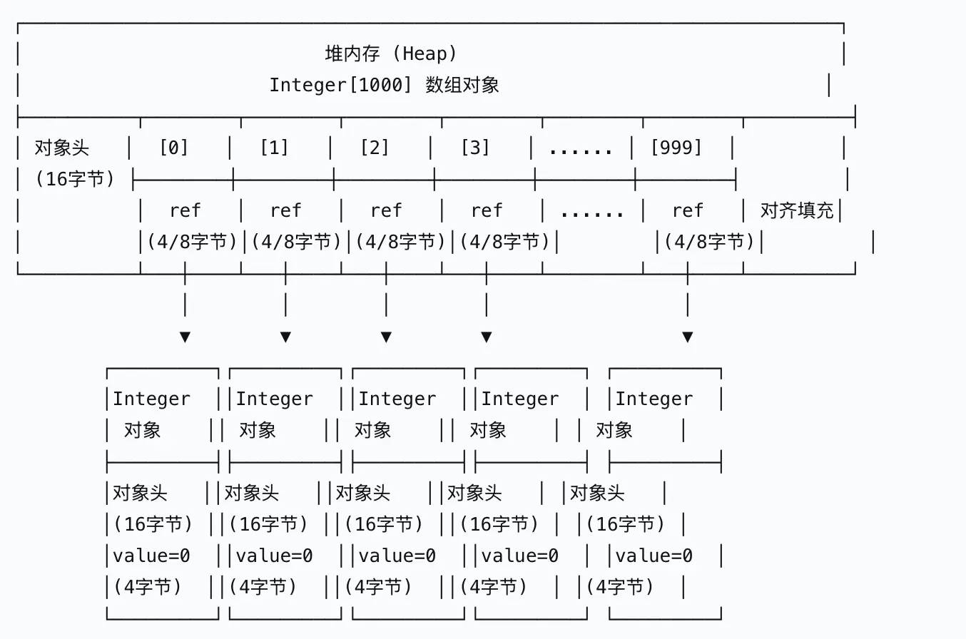 // 总内存: 1000个对象引用 + 每个Integer对象的内存开销