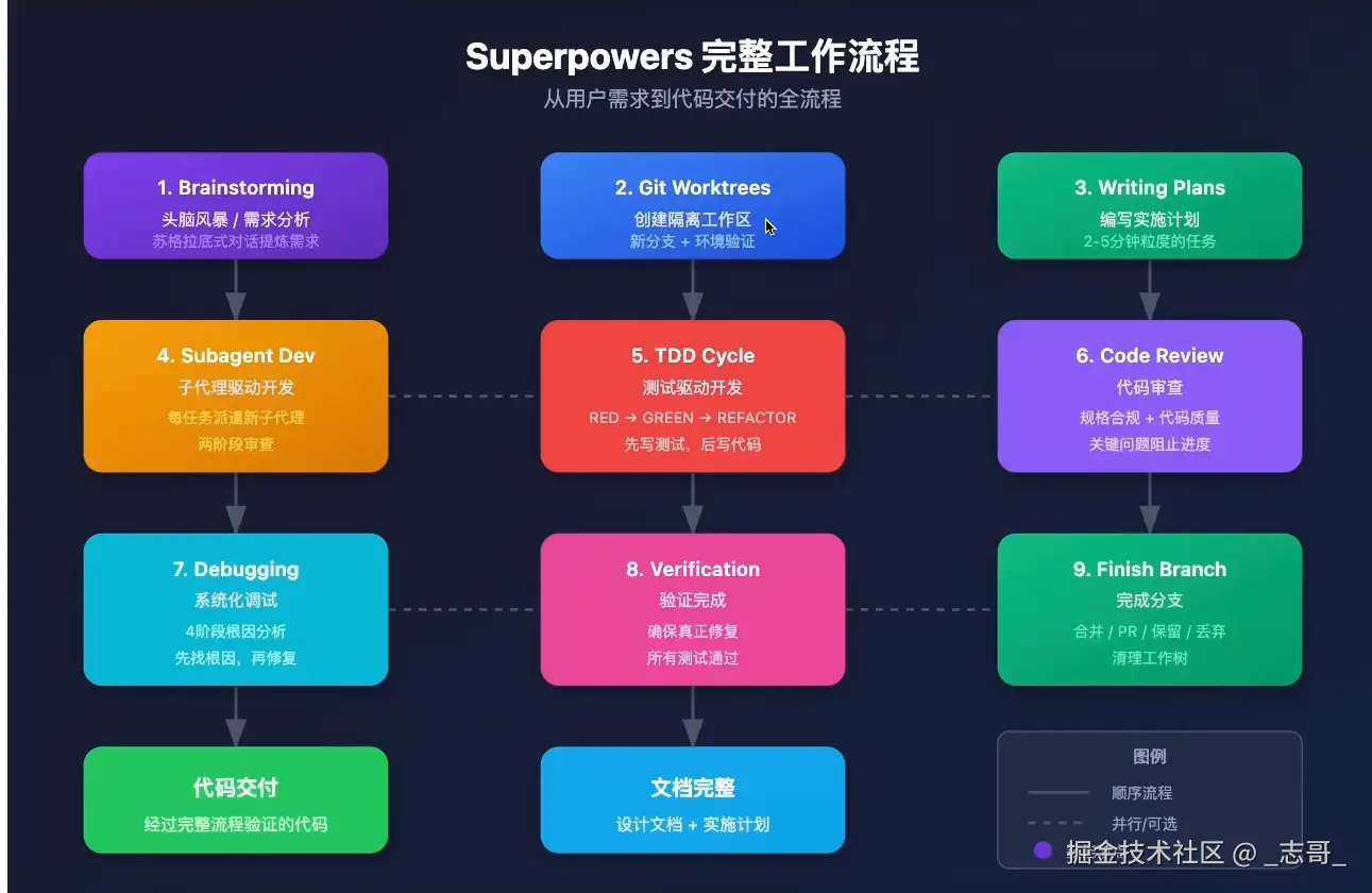 Superpowers 定义了一个完整的开发工作流:
