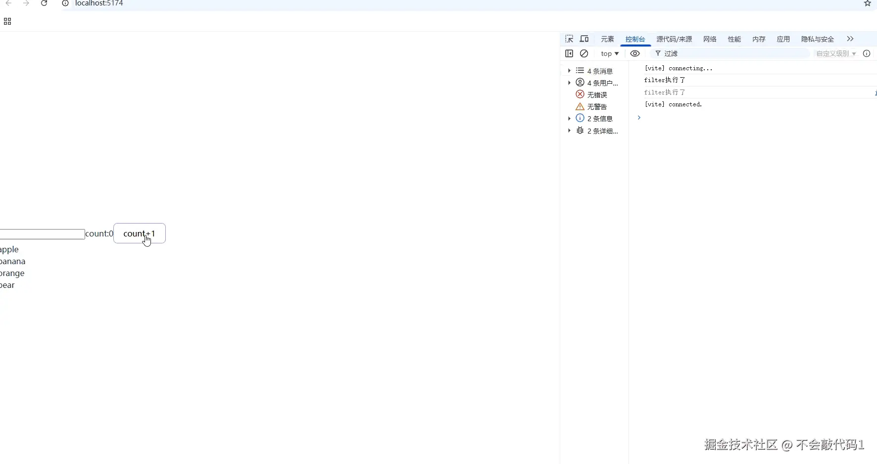 现在,点击 count 按钮不会触发 filter 重新执行,只有输入框改变时才会。