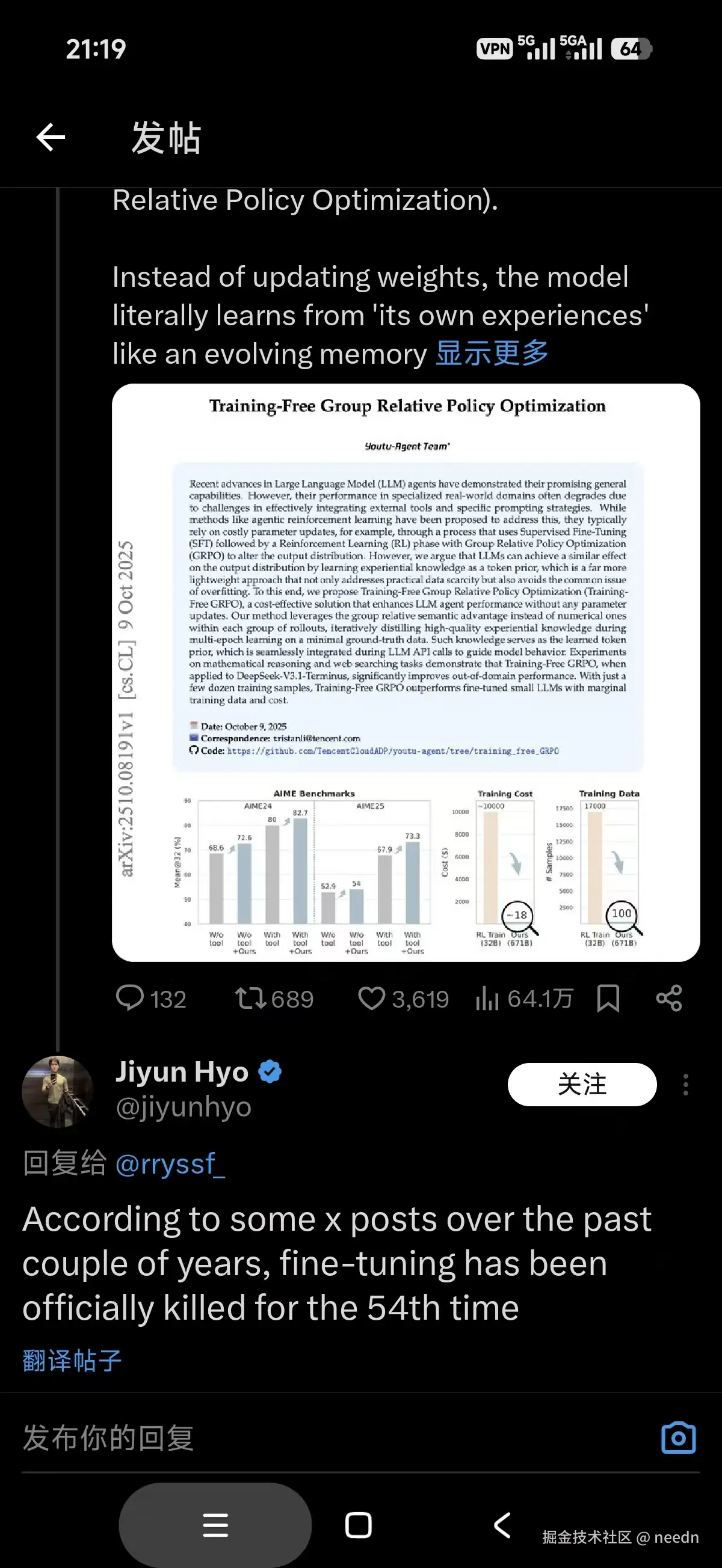 以初代Cursor为代表的AI辅助编程模式,即注重代码补全与简单AI对话的开发模式可能逐渐会从主流退潮而去,但因此炮轰IDE根本是逻辑不通。 AI时代的炒作,人的浮躁已经达到了前所未有的巅峰。 前不久在调研Youtu-Agent时刷到一个颇具讽刺意味的评论。大意是说Youtu发表了一项研究关于Agent提示词自我优化来达到超越Fine-tuning的performance。评论提到Fine-tuning已经在X上被Kill了54次。