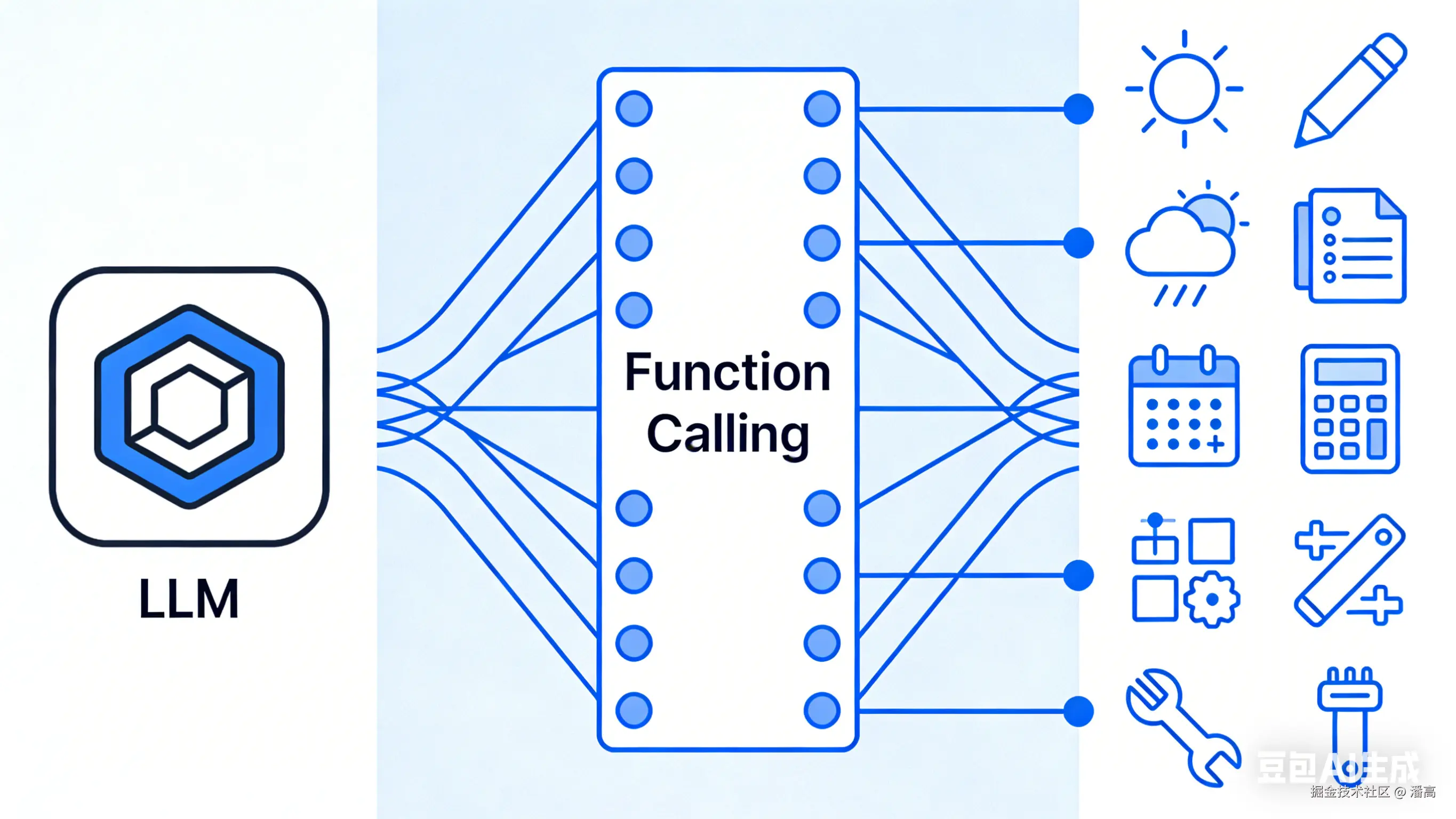 可以对接的工具越来越多:查天气、读文件、运行脚本、分析PDF......为了管理这些五花八门的工具,不让LLM调用时出错,开发者们制定了一套标准的"沟通暗号"。这就是 Function Calling ,中文名叫 函数调用。