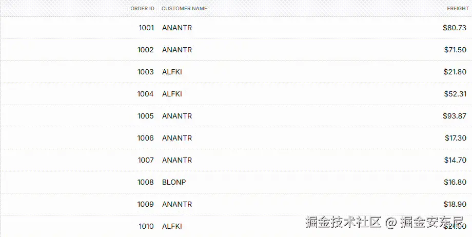 作者举了一个简单的订单列表:列包括 OrderID 、CustomerID 、Freight,并让 Freight 每 5 秒更新一次,模拟实时价格变化。