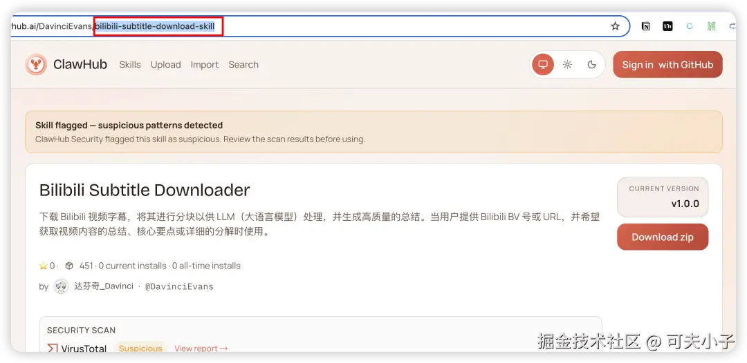 我现在有一个需求,找一个总结BIlibili视频的技能,我就打开clawhub.ai/,搜索Bilibili...