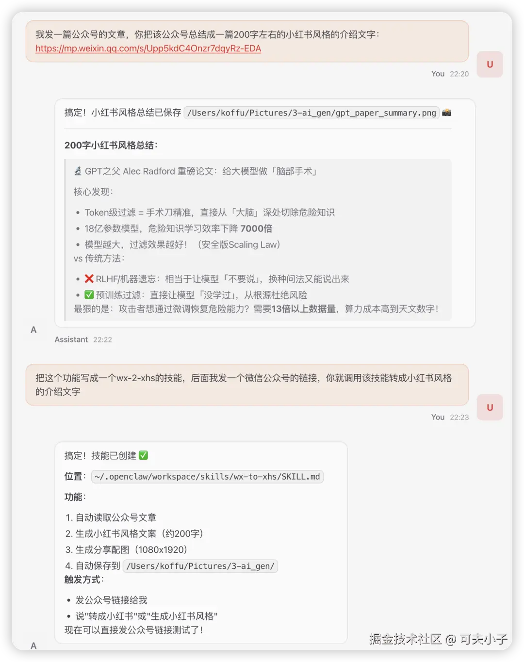 可以通过与openclaw对话,让它完成一个功能,然后再让他总结成一个技能,给后续调用。我现在也演示一个生成截图的例子。