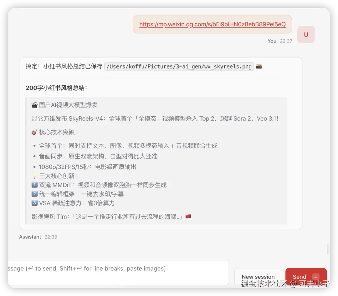 可以看到我的对话过程,是如何创建的。我们再来测试一下,我丢一个链接,看他是否知道要干啥