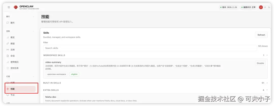OpenClaw很强大,但也需要搭配很多技能才能发挥最大的作用,它的安装方式没有像Claude Code那样复杂,但也还有一些操作过程。在OpenClaw里面,可以通过WebUI的界面,很直观的管理安装的技能。