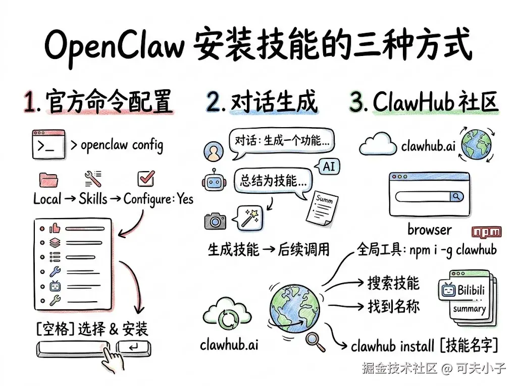以上我自己在实际使用openclaw过程中,总结的三个创建、使用技能的方式。我所使用的例子也比较简单,只是为了演示整个流程。大家可以结合自己的想象,研究新的玩法,可以在评论区交流一下。
