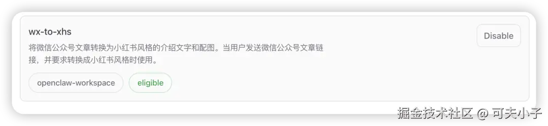 确认一个风险提示之后,就安装完成。最后他的安装目录是/Users/koffu/.openclaw/workspace/skills/下面,我们也可以看他的md文件和脚本文件来分析他的实现方案。