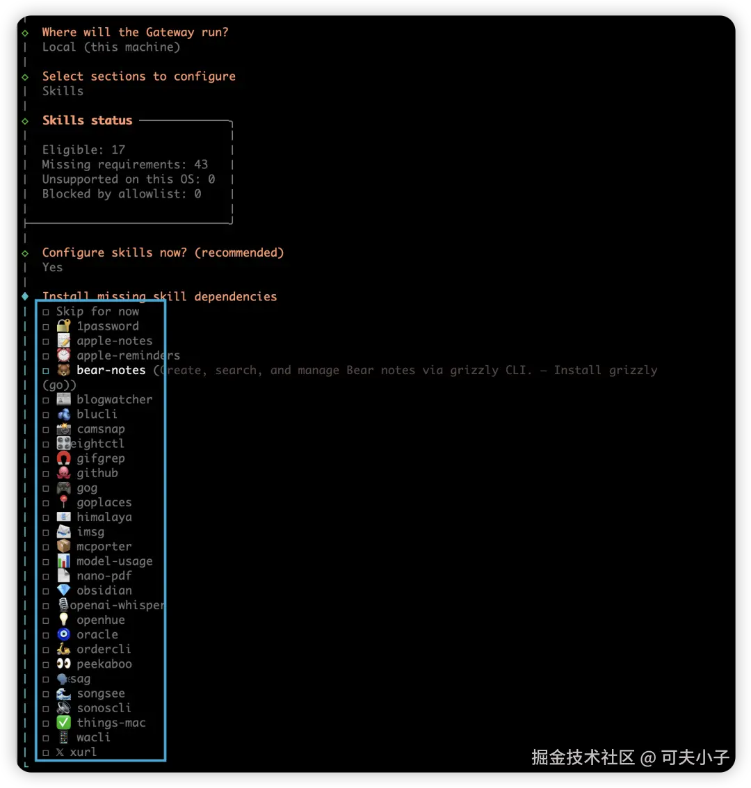 通过openclaw config 命令,选择Local→Skills→Configure Yes就可以看到openclaw官方预置的几十个skills,选择自己需要的,空格键选择,继续安装