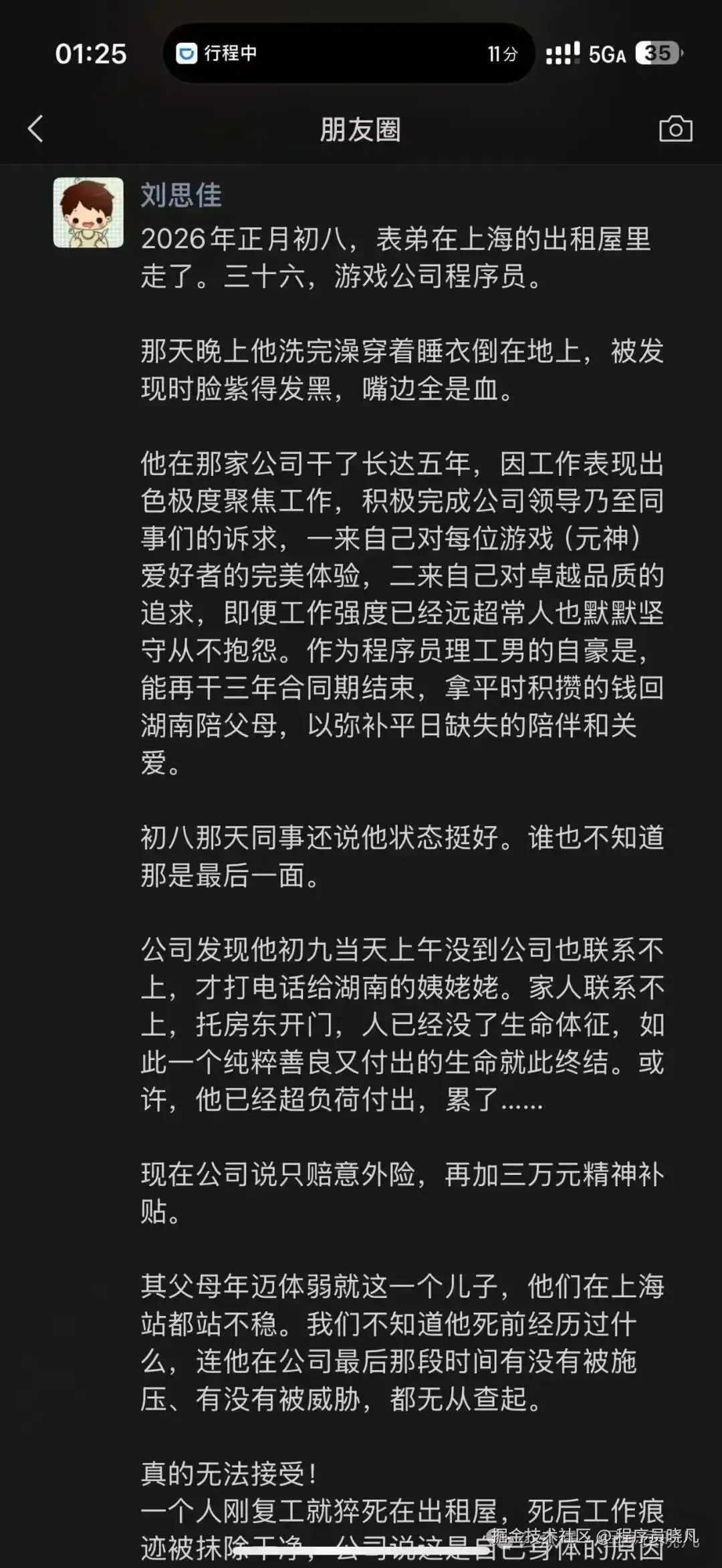 米哈游一位36岁的程序员,春节复工第二天,倒在出租屋的浴室里。同事说他初八状态还挺好,谁也不知道那是最后一面。