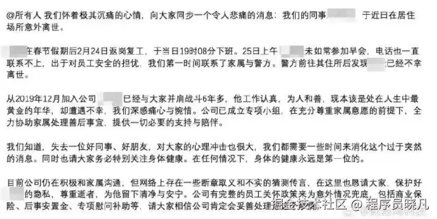 那位离世的程序员,家属说他"工作表现出色极度聚焦","即便工作强度已经远超常人也默默坚守从不抱怨"。