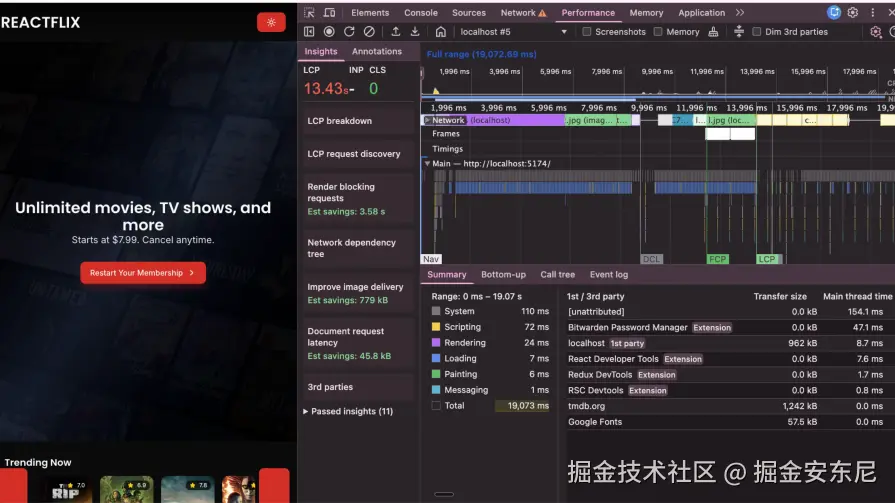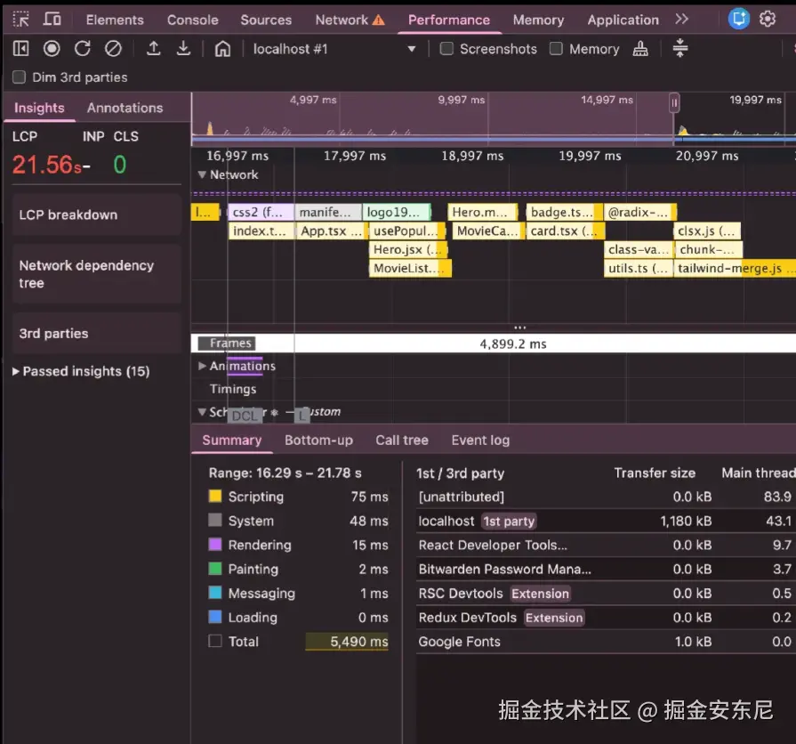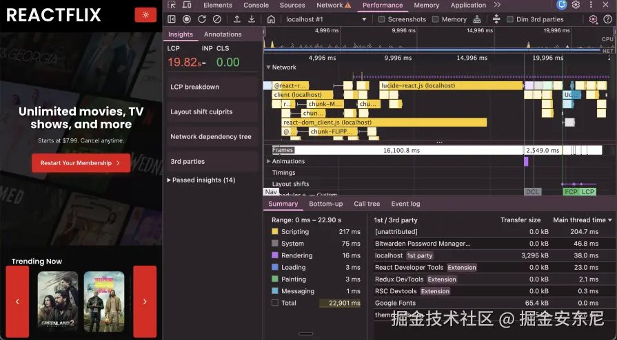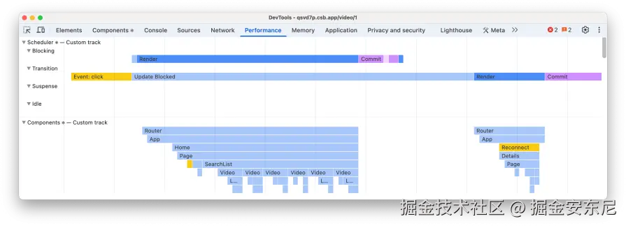 React 19 引入了自定义的 Performance tracks。它把性能分析能力直接集成进 Chrome DevTools 的 Performance 面板,让你能定位真实的渲染瓶颈,而不是凭感觉猜哪个组件慢。