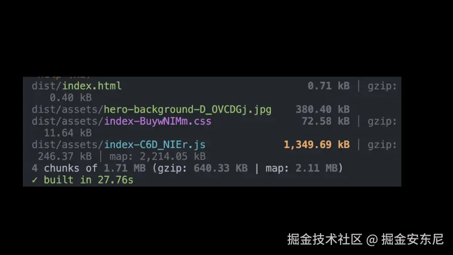 确认生产环境启用了 JS 和 CSS 的压缩(minification)。 现代构建工具大多在 production 模式默认开启,但你最好确认"真的有生效"。压缩会移除空白、缩短变量名,并做其他转换,显著减少文件体积。