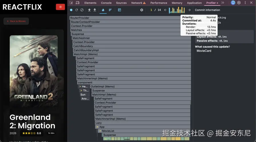 你会看到:应用的重渲染次数下降了,峰值也变低了,最大一次渲染为 13.1ms: