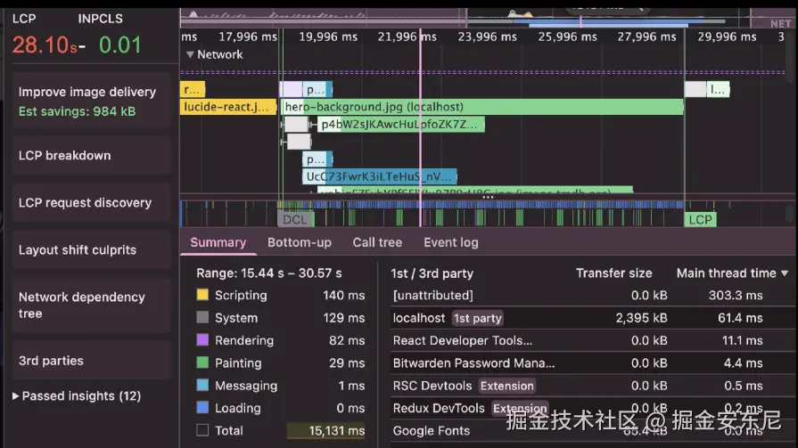 在这份指南中,我会分享一个循序渐进的框架:从分析 bundle 开始,一路优化到服务端渲染。按这四个阶段走,你可以在不牺牲代码质量和开发体验的前提下,把 LCP 从 28 秒降到约 1 秒(超过 93% 的提升!)。