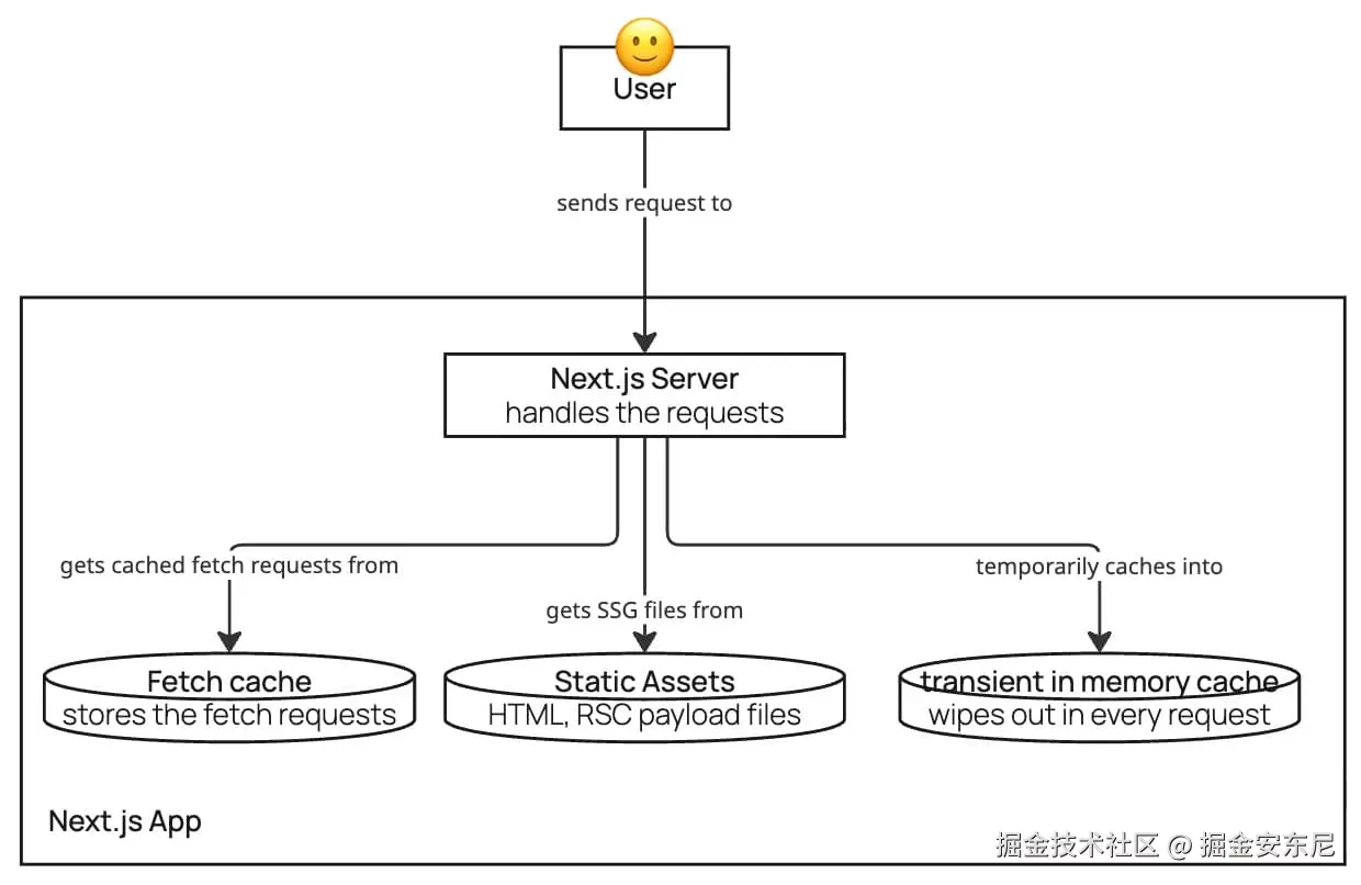 运行阶段(Runtime)每个请求也会尝试命中缓存:可能命中预生成 HTML、RSC payload,或命中 fetch 结果(通常落在文件系统缓存里)。如果你额外使用 React cache 或自定义缓存,也会参与最终响应的生成。